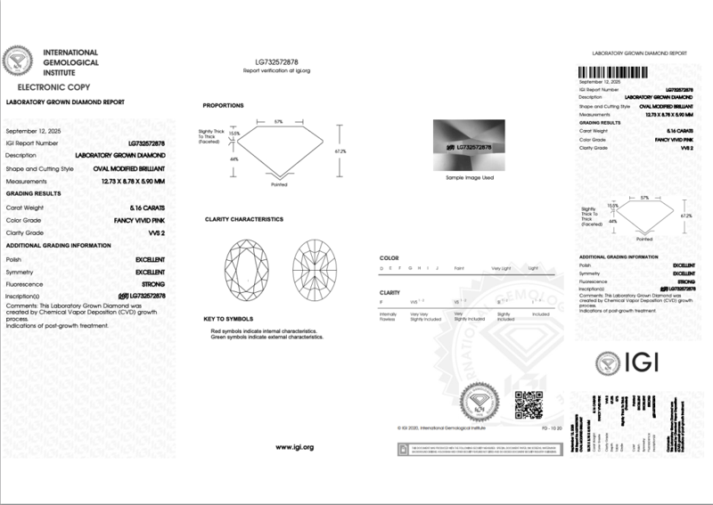 OVAL 5.16CT FANCY VIVID PINK VVS2 LAB GROWN DIAMOND Dimensions: 12.73 x 8.78 x 5.90mms Accompanied By Igi Report Number Igi - 732572878 Condition: Good - Refer to images 0162959+4CROSSDOCK