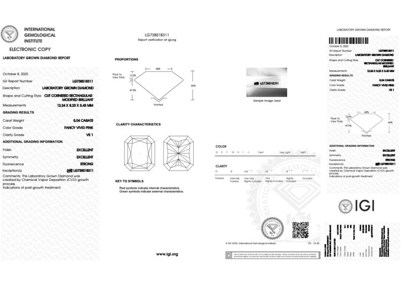 RADIANT 5.04CT FANCY VIVID PINK VS1 LAB GROWN DIAMOND Dimensions: 12.24 x 8.23 x 5.43mms Accompanied By Igi Report Number Igi - 738518311 Condition: Good - Refer to images 0162959+2CROSSDOCK