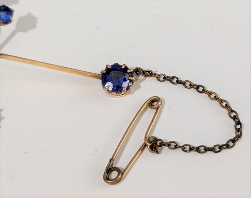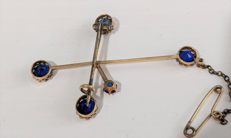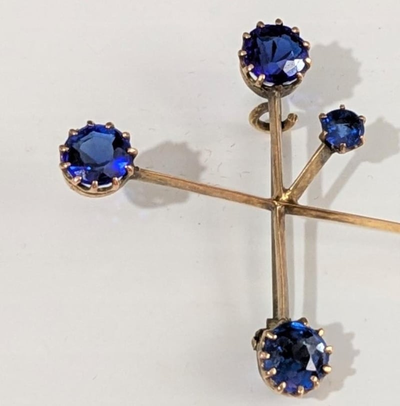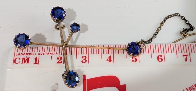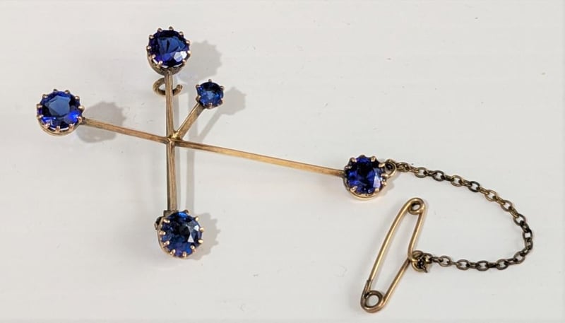 9CT GOLD AND BLUE STONES SOUTHERN CROSS BROOCH WITH SAFETY CHAIN