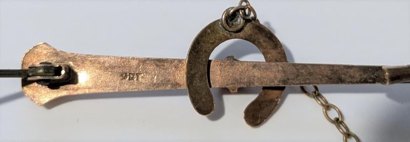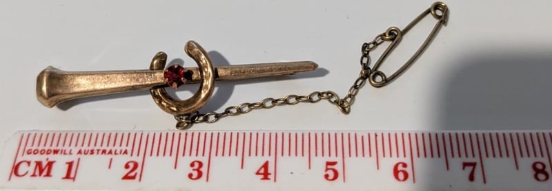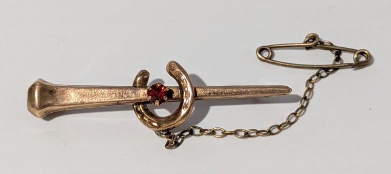 9CT GOLD VINTAGE HORESHOE & NAIL BROOCH WITH SAFETY CHAIN