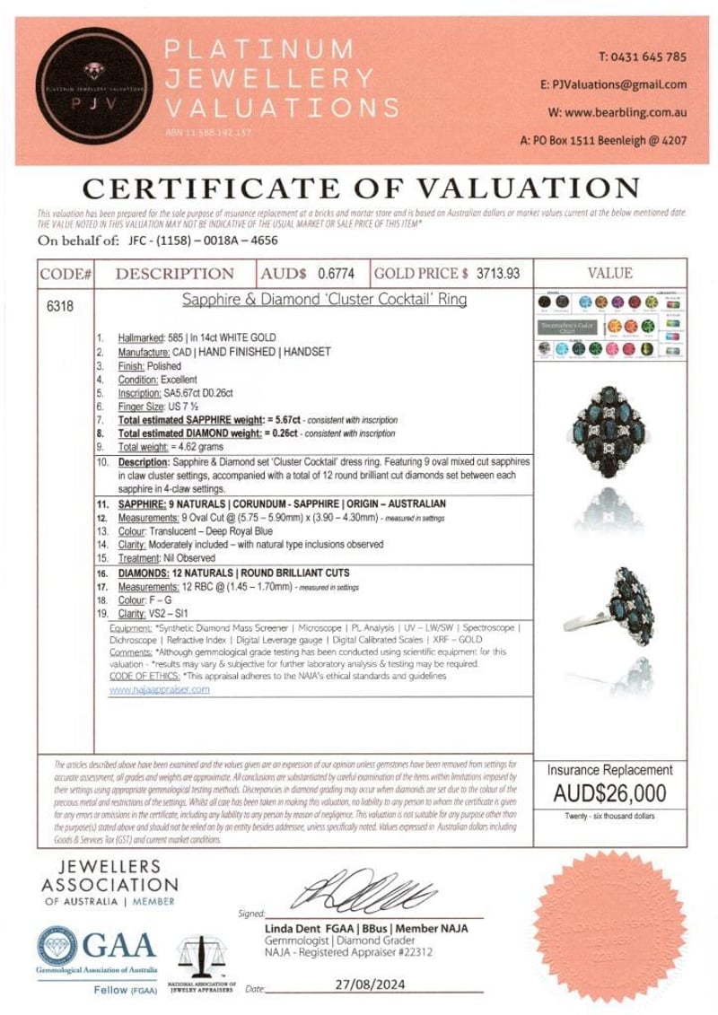 14Ct White Gold Australian Sapphire And Diamond Cluster Ring Featuring Centre, 9 Oval Cut, Deep Royal Blue Sapphires (5.67Ct Tsw, Moderately Included), Claw Set, With 12 Round Brilliant Cut Diamonds (0.26Ct Tdw, F-G Colour, Vs2-Si1 Clarity), 4 Claw Set. Ring Size O.