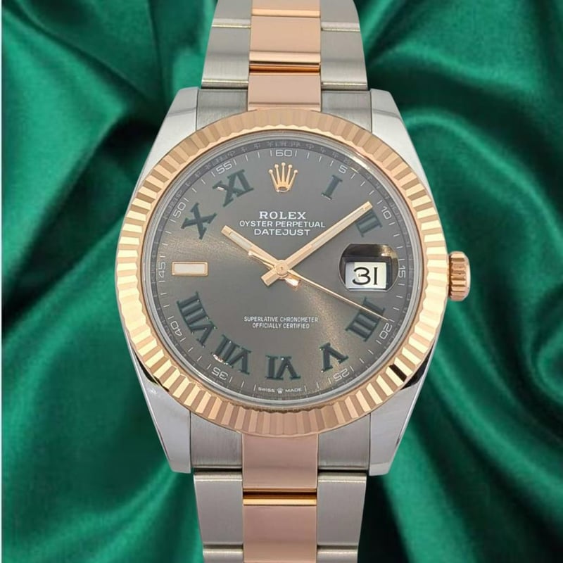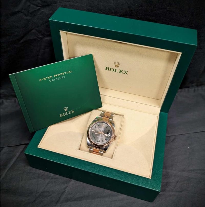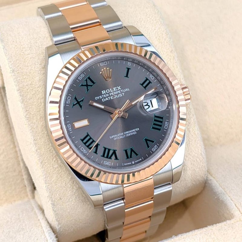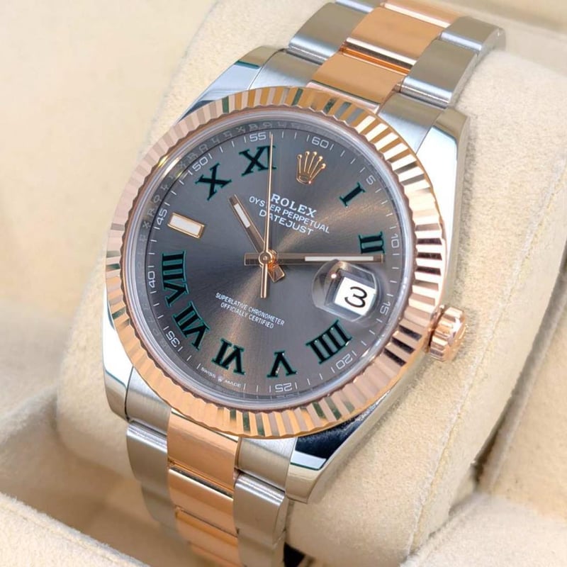 ROLEX 126331 DATEJUST EVEROSE TWO TONE WIMBLEDON DIAL 41MM 2020 Brand: RolexReference: 126331Model: Datejust 41 – Everose Two Tone, Sunburst Slate Roman ‘Wimbledon’ DialCase Size: 41MmCirca: 2020Movement: AutomaticCondition: Very GoodBox: Yes; Includes Datejust BookletPapers: No Condition: Good - Refer Images 0488323+11