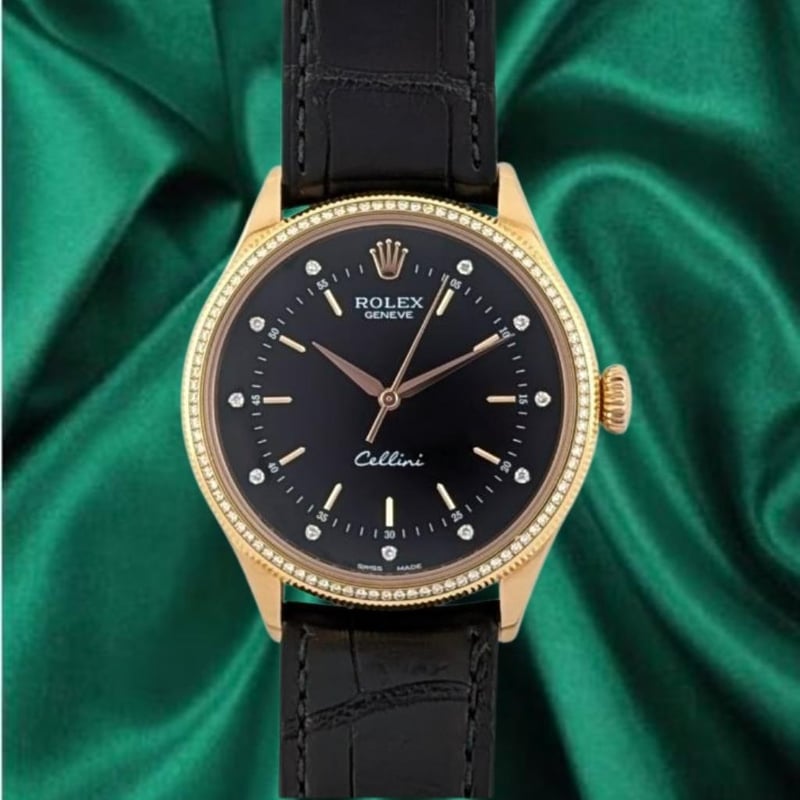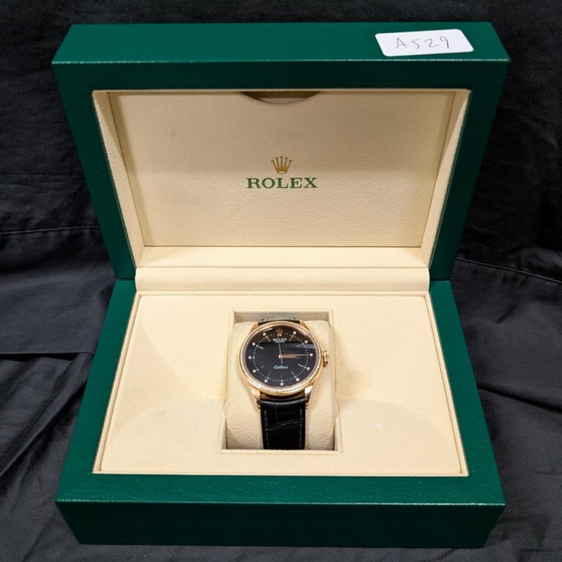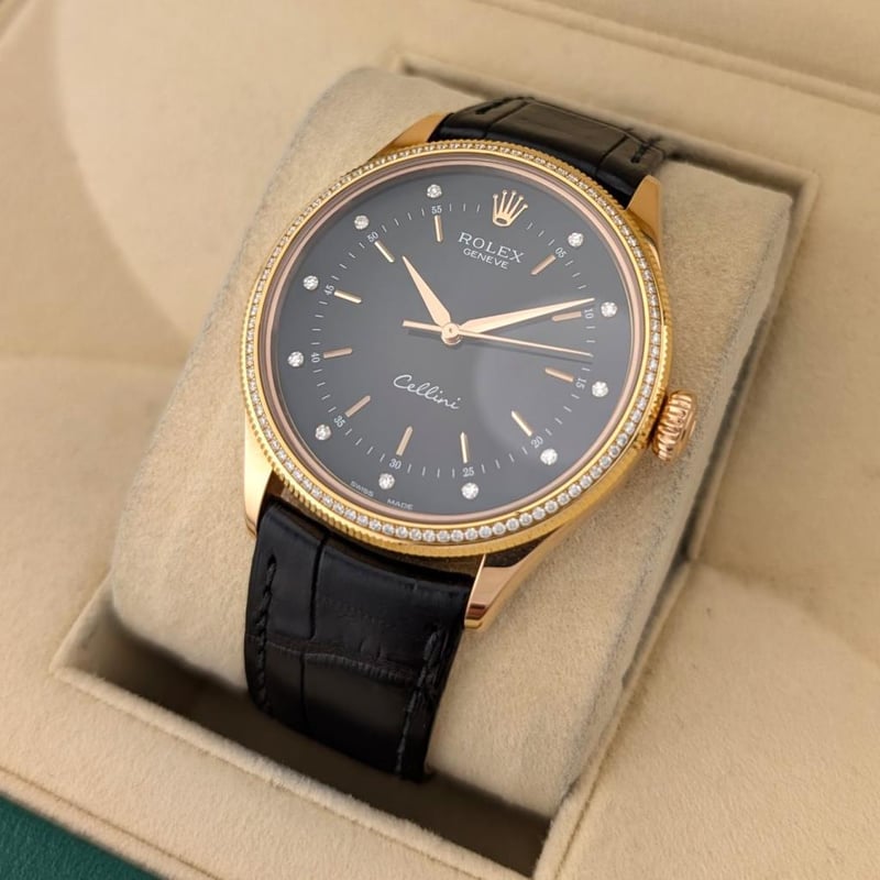 ROLEX 50605RBR CELLINI TIME 18K BLACK DIAMOND DIAL 39MM 2015 Brand: RolexReference: 50605RbrModel: Cellini Time 18K Rose Gold Black Diamond DialCase Size: 39MmCirca: 2015Movement: AutomaticCondition: Very GoodBox: YesPapers: No Condition: Good - Refer Images 0488323+4
