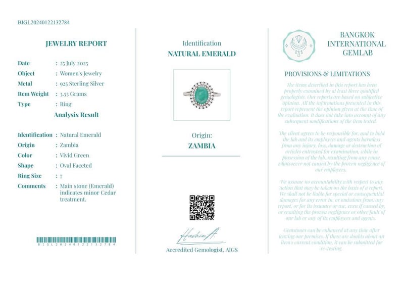 NATURAL ZAMBIAN EMERALD RING ON 925 SILVER - WITH CERTIFICATE Gemstone : Natural Zambian EmeraldCertificate Number : Bigl20240122132784Item Total Weight : 3.53 GramsMain Stone Color : Vivid GreenSize : 7Comments : Main Stone (Emerald) Indicates Minor Cedar Treatment. ✻ Verify Report Online At Www.Bangkokinternationalgemlab.Co 0+21
