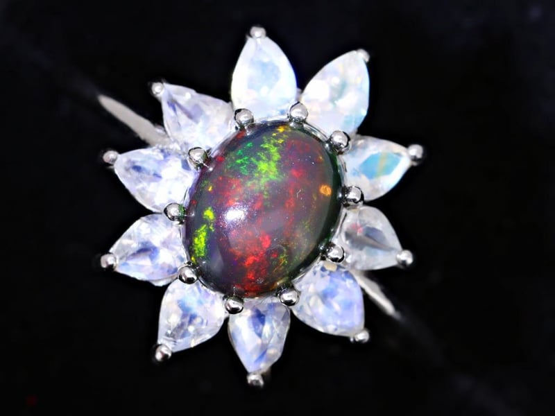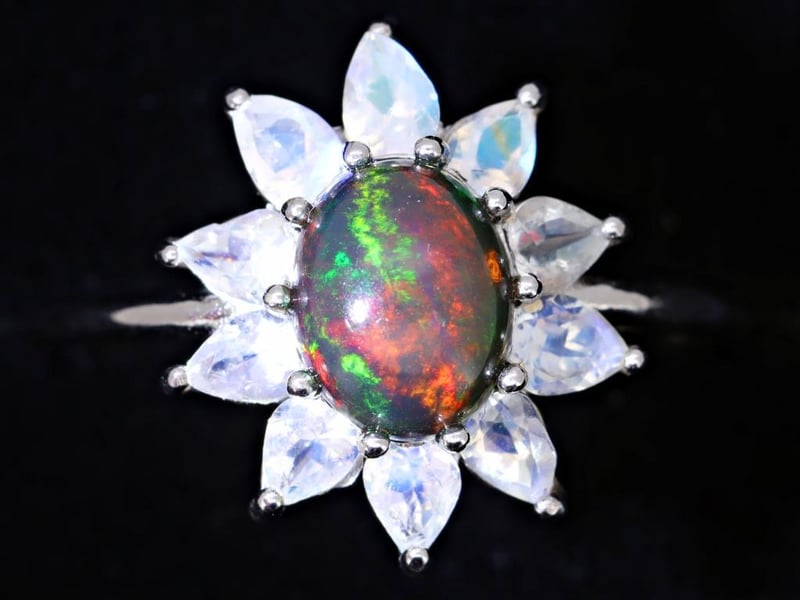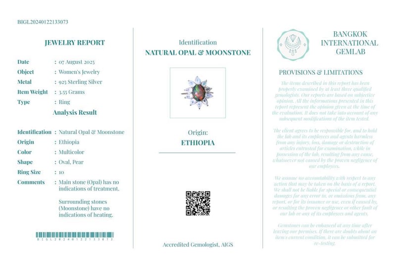 NATURAL OPAL & MOONSTONE RING ON 925 SILVER - WITH CERTIFICATE Gemstone : Natural Opal & MoonstoneCertificate Number : Bigl20240122133073Item Total Weight : 3.55 GramsMain Stone Color : MulticolorSize : 10Comments : Main Stone (Opal) Has No Indications Of Treatment.Surrounding Stones (Moonstone) Have No Indications Of Heating. ✻ Verify Report Online At Www.Bangkokinternationalgemlab.Co 0+40