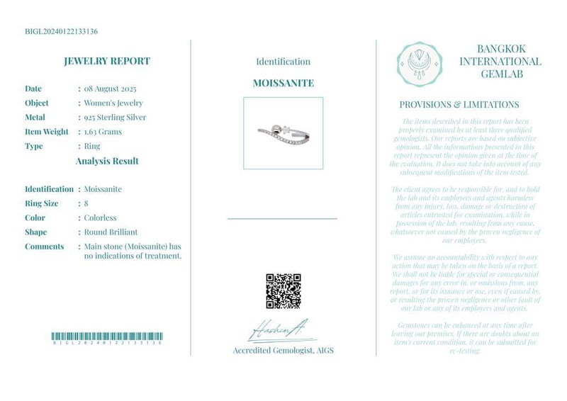 MOISSANITE RING ON 925 SILVER - WITH CERTIFICATE Gemstone : MoissaniteCertificate Number : Bigl20240122133136Item Total Weight : 1.63 GramsMain Stone Color : ColorlessSize : 8Comments : Main Stone (Moissanite) Has No Indications Of Treatment. ✻ Verify Report Online At Www.Bangkokinternationalgemlab.Co 0+44