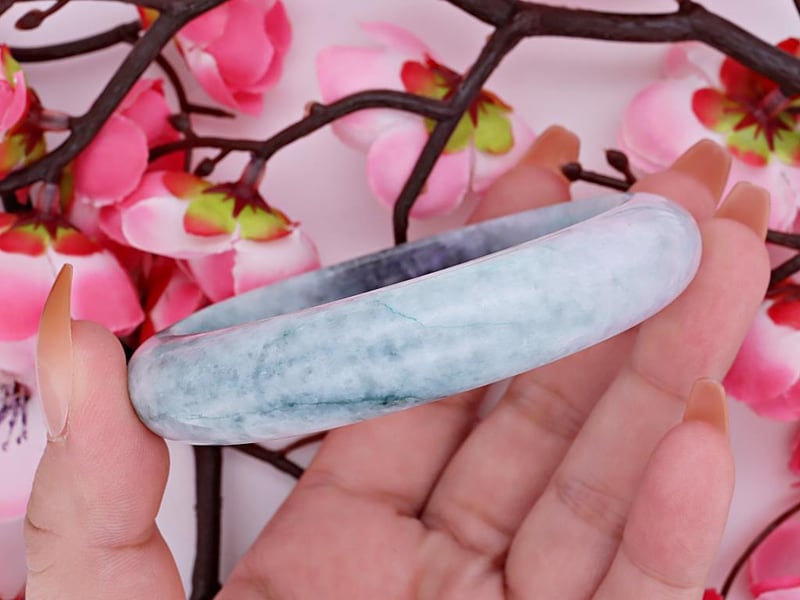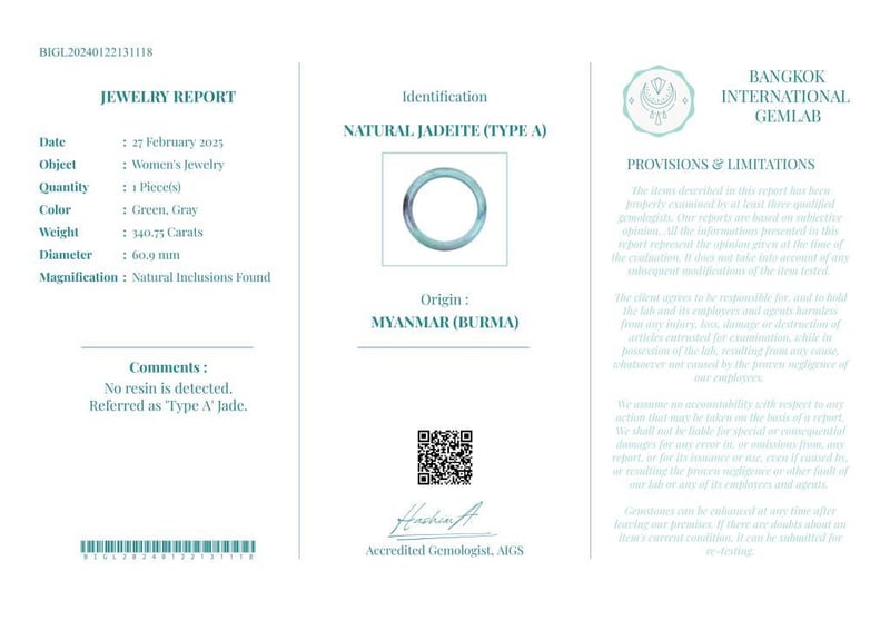 NATURAL BURMESE JADE BANGLE - WITH CERTIFICATE Gemstone : Natural Burmese JadeCertificate Number : Bigl20240122131118Item Total Weight : 340.75 GramsMain Stone Color : Green, GraySize : 60.9Comments : No Resin Is Detected.Referred As 'Type A' Jade. ✻ Verify Report Online At Www.Bangkokinternationalgemlab.Co 0+4