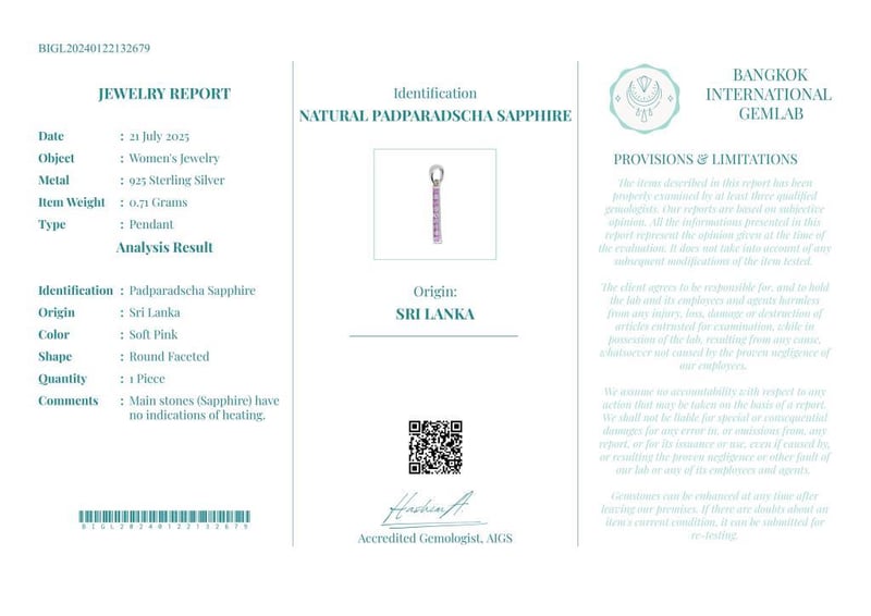 NATURAL PADPARADSCHA SAPPHIRE (UNHEATED) PENDANT ON 925 SILVER - WITH CERTIFICATE Gemstone : Natural Padparadscha Sapphire (Unheated)Certificate Number : Bigl20240122132679Item Total Weight : 0.71 GramsMain Stone Color : Soft PinkSize : Comments : Main Stones (Sapphire) Have No Indications Of Heating. ✻ Verify Report Online At Www.Bangkokinternationalgemlab.Co 0+14