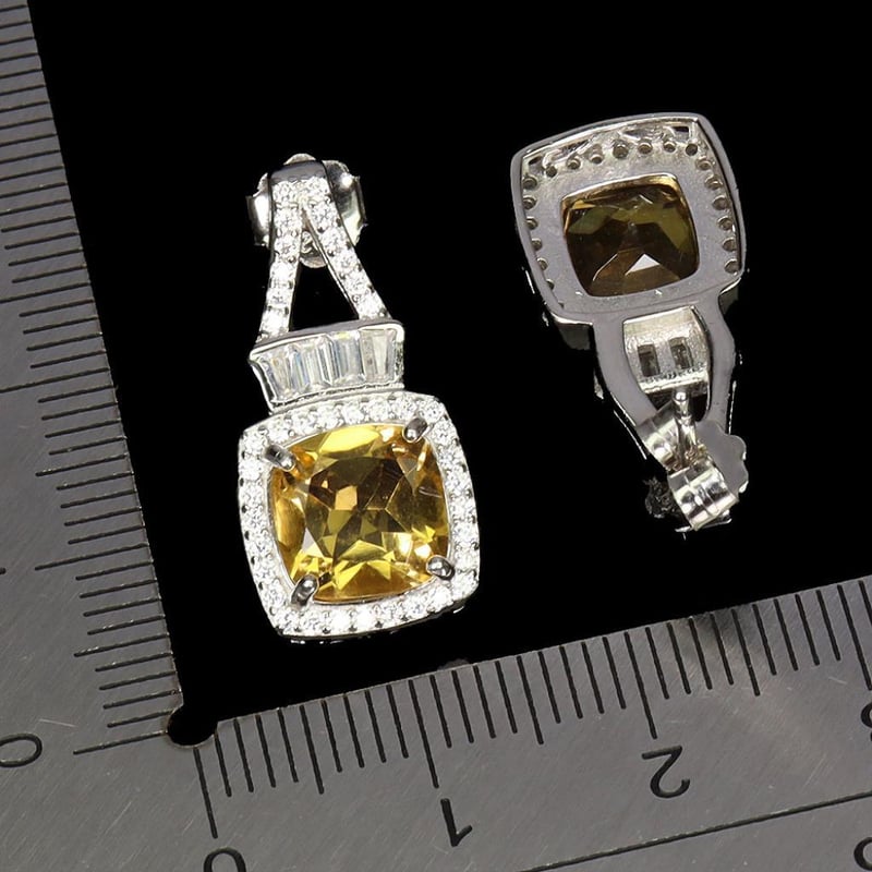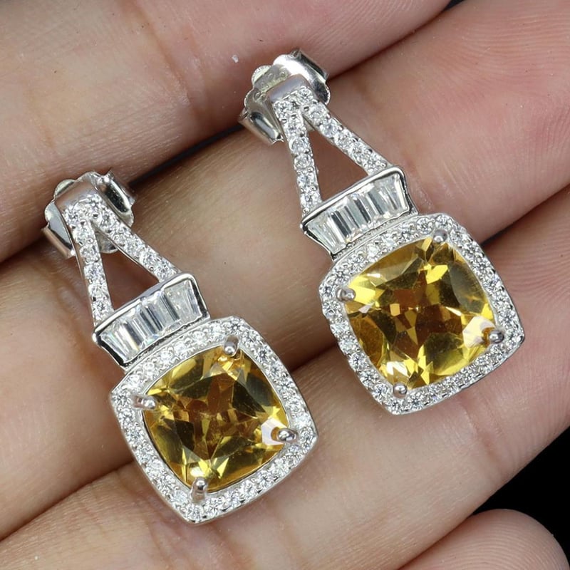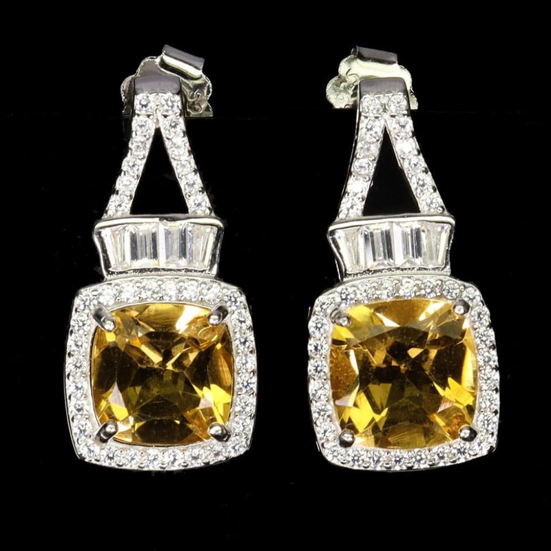 Natural Citrine Earrings. Made Ins Solid Sterling Silver And Plated In14K White Gold. Features Natural Cushion Cut Golden Citrine And Sparkling Czs. Earrings Measure 22.0 X 11.0 Mm.