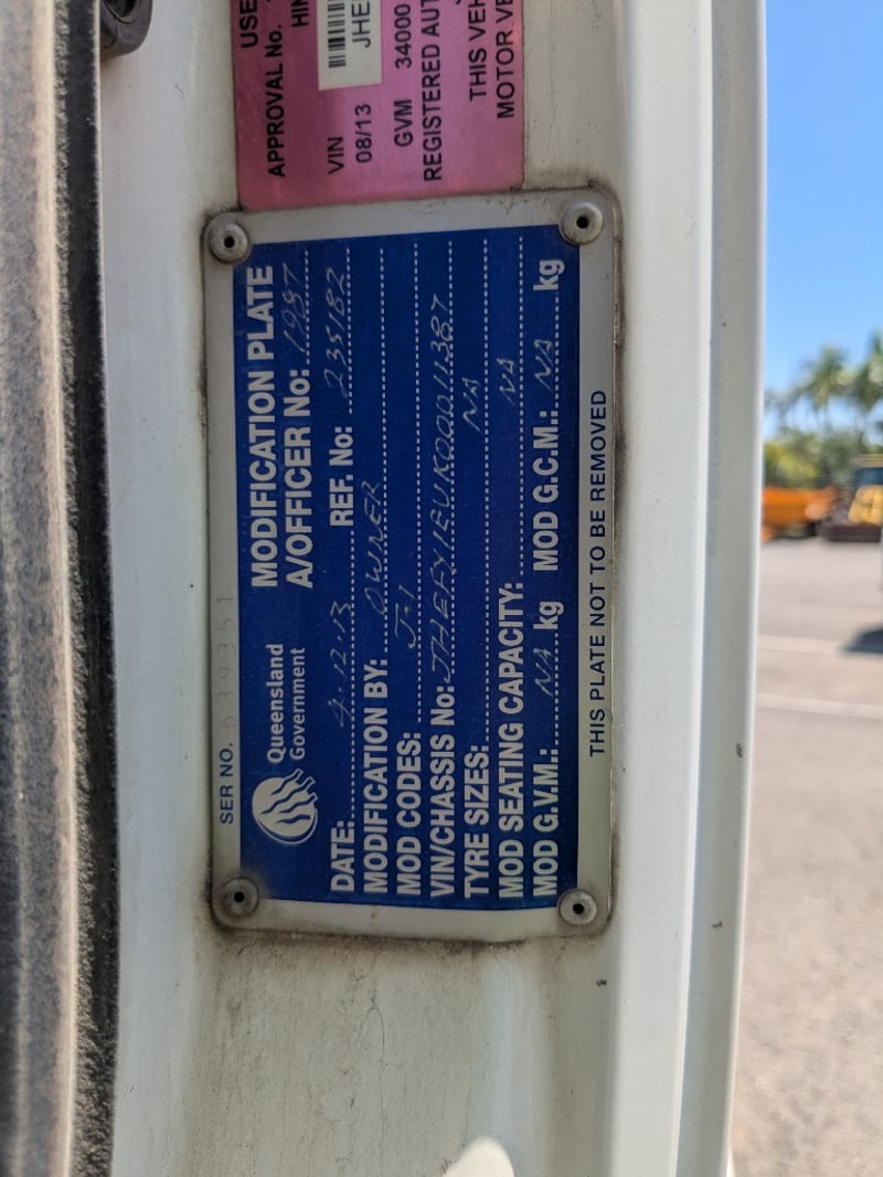 Description: Aircon, CD player, Radio, UHF, Day bed, over head storage, Electric windows, cab operating controls, exterior operating controls, Manual handbrake,