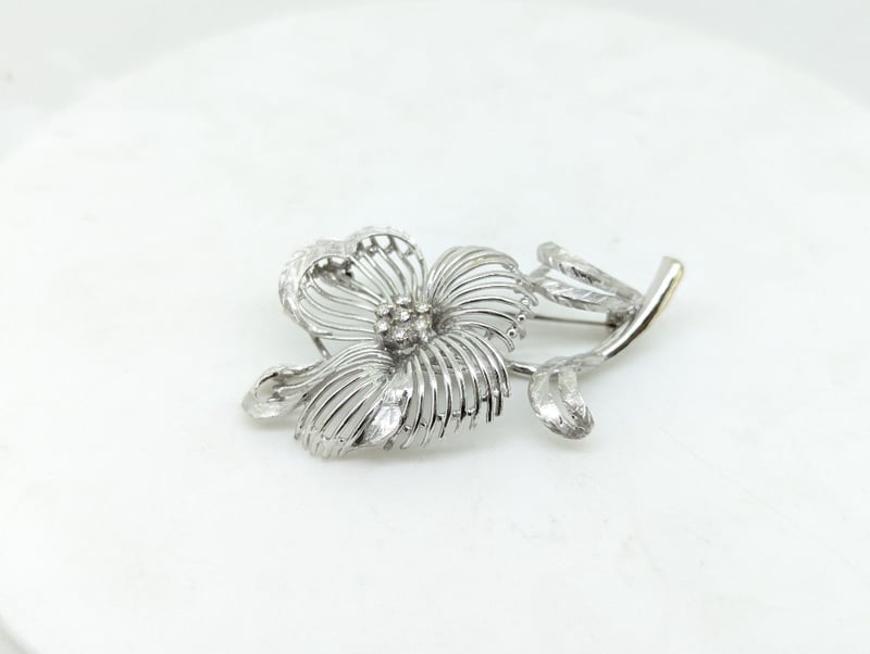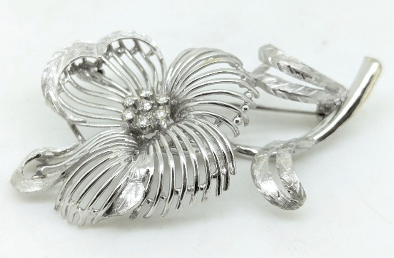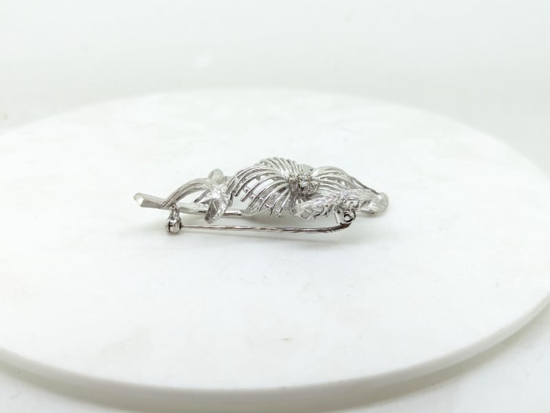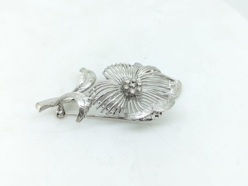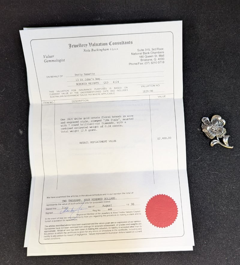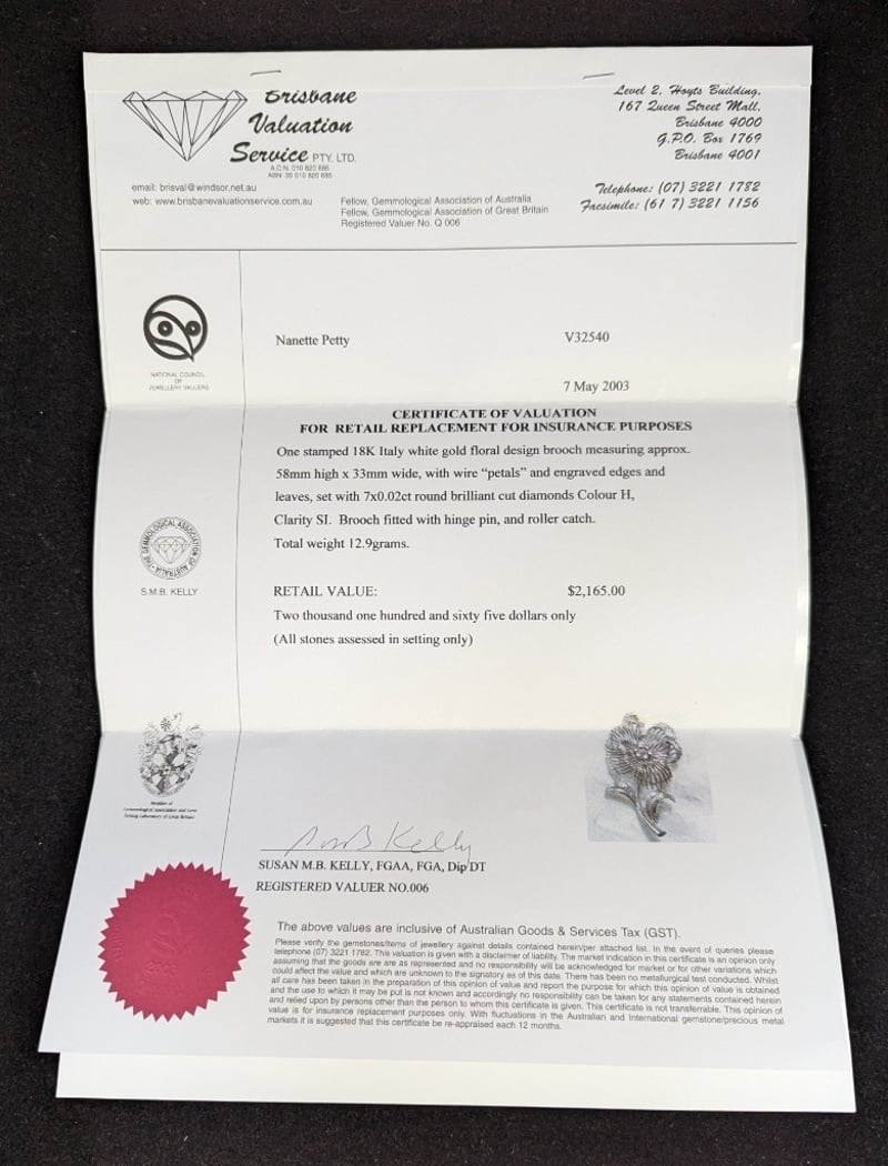 18CT WHITE GOLD ORNATE FLORAL BROOCH WITH 2 CERTIFICATE OF VALUATIONS
