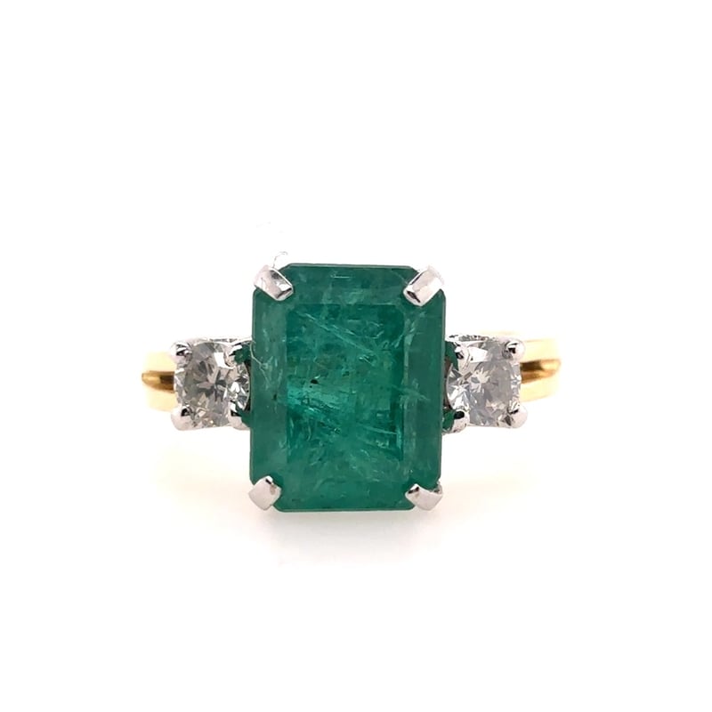 18CT YELLOW AND WHITE GOLD EMERALD AND DIAMOND RING.