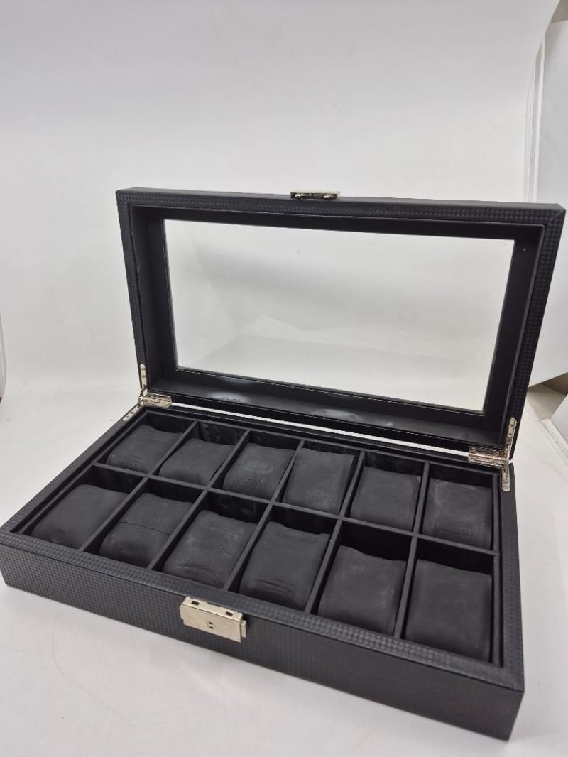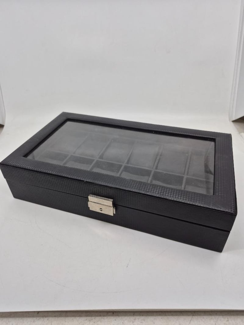 WATCH BOX, BLACK WITH GLASS TOP, FELT UNDERSIDE, LOCKABLE - KEY NOT INCLUDED
