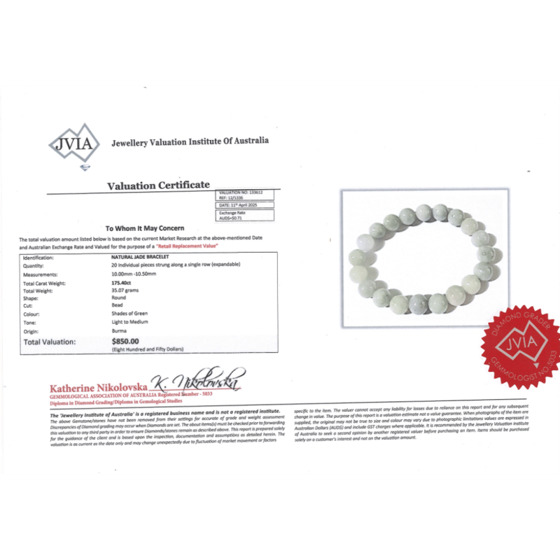 175.40CT TSW BURMESE JADE, BEAD BRACELET. The Bracelet Features, 20 Round Shaped Beads (10.00Mm - 10.50Mm), Light-Medium Shades Of Green, Individually Strung Along A Single Row (Expandable). 175.40Ct Tsw Burmese Jade, Bead Bracelet. The Bracelet Features, 20 Round Shaped Beads (10.00Mm - 10.50Mm), Light-Medium Shades Of Green, Individually Strung Along A Single Row (Expandable). Jewellery Valuations Provided By A Third Party Professional Not Directly Associated With Lloyds Auctions at AUD $850.00This Insurance Valuation has been provided by a registered Jewellery Valuer and is intended for insurance purposes only. The valuation amount has no bearing on the auction value of the item. Any questions regarding the valuation should be directed to the issuing Valuer (refer to contact details on the certificate) as Lloyds have no association or relationship with the Valuer or the valuation amount contained within the valuation. Condition: NEW 0584876+1450