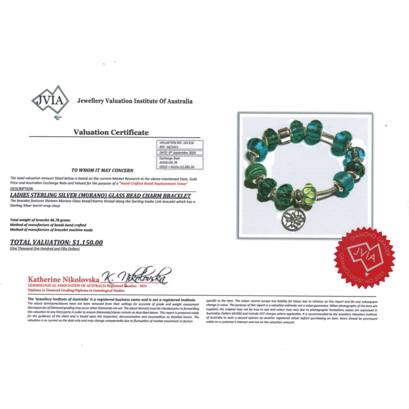 925 STERLING SILVER, MURANO GLASS BEAD AND CHARM BRACELET. The Bracelet Features, 13 Sterling Silver And Murano Glass Charms. The Sterling Silver Snake Link Bracelet Has A Sterling Silver Snap Clasp Closure. Total Weight 46.78 Grams. 925 Sterling Silver, Murano Glass Bead And Charm Bracelet. The Bracelet Features, 13 Sterling Silver And Murano Glass Charms. The Sterling Silver Snake Link Bracelet Has A Sterling Silver Snap Clasp Closure. Total Weight 46.78 Grams. Jewellery Valuations Provided By A Third Party Professional Not Directly Associated With Lloyds Auctions at AUD $1,150.00This Insurance Valuation has been provided by a registered Jewellery Valuer and is intended for insurance purposes only. The valuation amount has no bearing on the auction value of the item. Any questions regarding the valuation should be directed to the issuing Valuer (refer to contact details on the certificate) as Lloyds have no association or relationship with the Valuer or the valuation amount contained within the valuation. Condition: NEW 0584876+1427