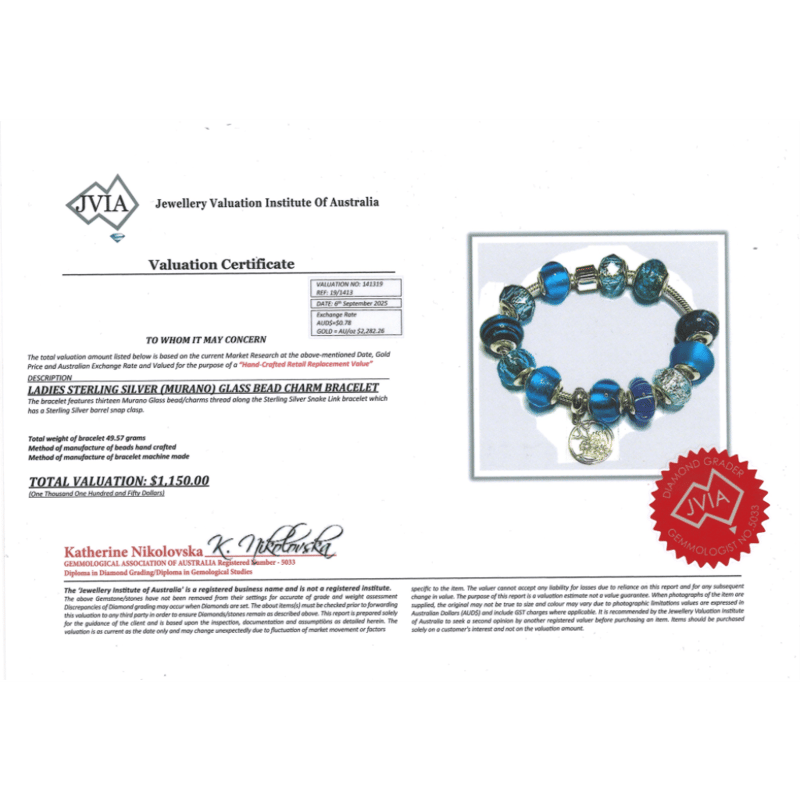 925 STERLING SILVER, MURANO GLASS BEAD AND CHARM BRACELET. The Bracelet Features, 13 Sterling Silver And Murano Glass Charms. The Sterling Silver Snake Link Bracelet Has A Sterling Silver Snap Clasp Closure. Total Weight 49.57 Grams. 925 Sterling Silver, Murano Glass Bead And Charm Bracelet. The Bracelet Features, 13 Sterling Silver And Murano Glass Charms. The Sterling Silver Snake Link Bracelet Has A Sterling Silver Snap Clasp Closure. Total Weight 49.57 Grams. Jewellery Valuations Provided By A Third Party Professional Not Directly Associated With Lloyds Auctions at AUD $1,150.00This Insurance Valuation has been provided by a registered Jewellery Valuer and is intended for insurance purposes only. The valuation amount has no bearing on the auction value of the item. Any questions regarding the valuation should be directed to the issuing Valuer (refer to contact details on the certificate) as Lloyds have no association or relationship with the Valuer or the valuation amount contained within the valuation. Condition: NEW 0584876+1472