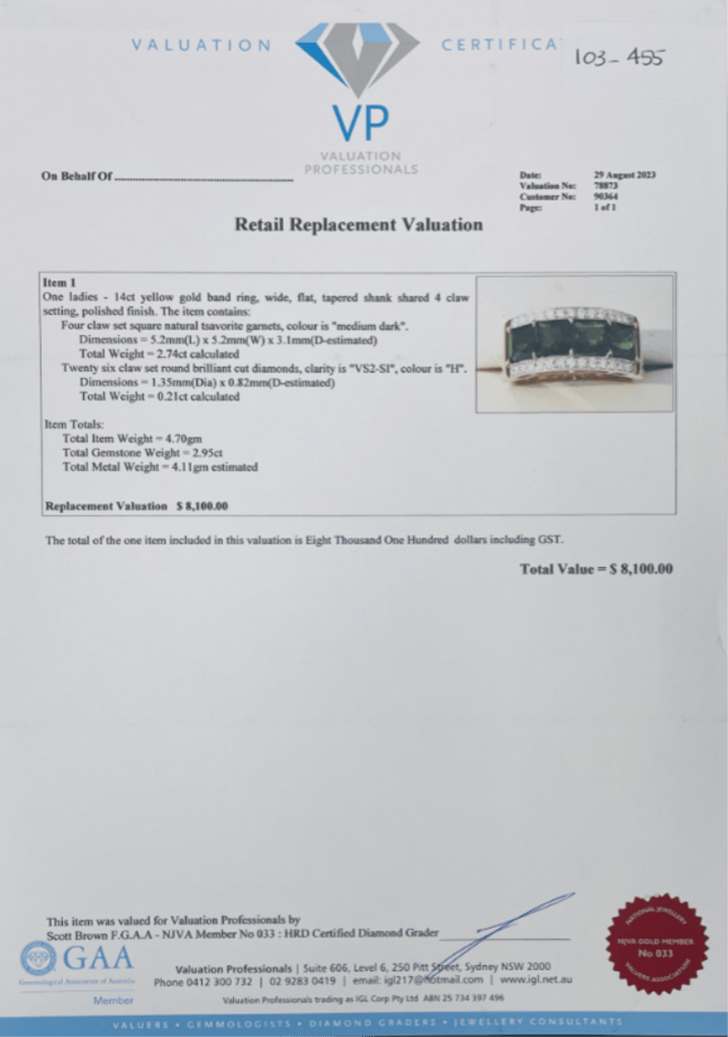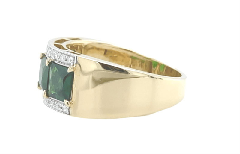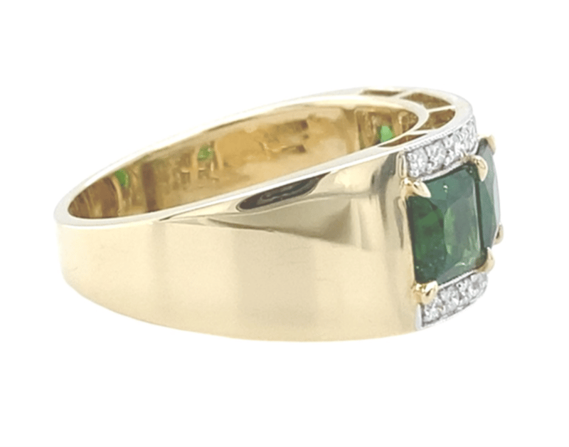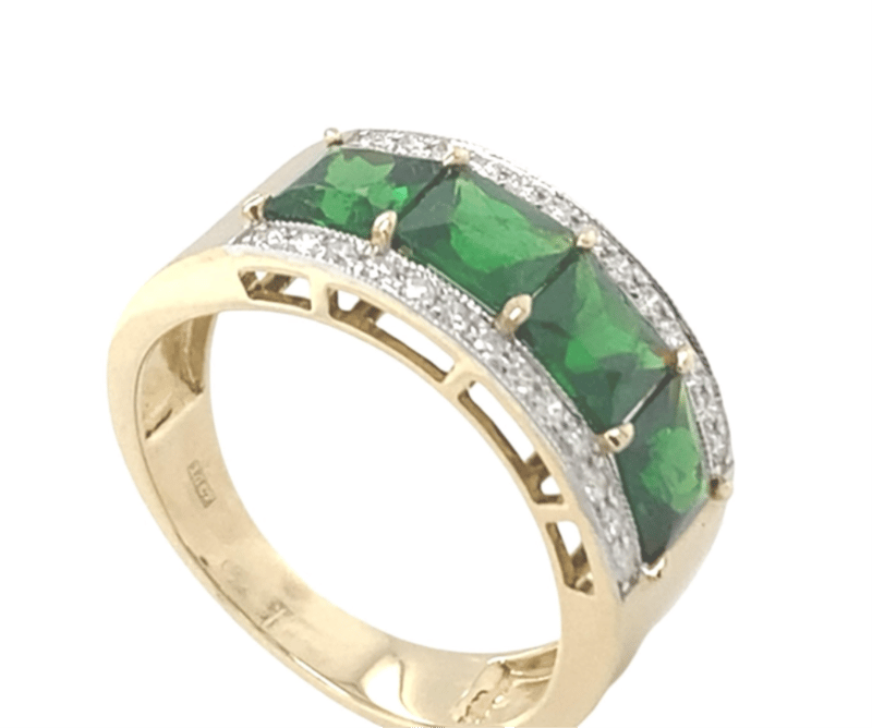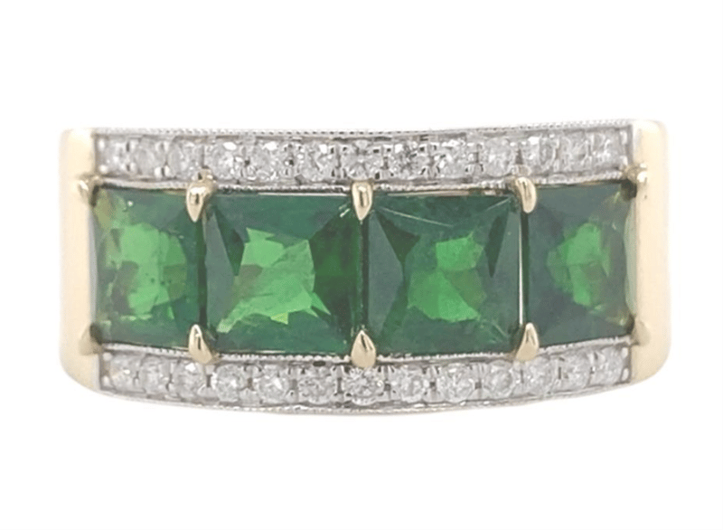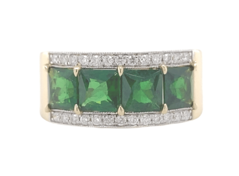 Certified 14Ct Yellow Gold Ladies Band Ring Featuring Four Square Natural Tsavorite Garnets Of Medium-Dark Green Colour, Set In A Shared Four-Claw Mount. Accented By Twenty-Six Round Brilliant Cut Diamonds (H Colour, Vs2–Si1 Clarity). Professionally Appraised By Valuation Professionals (Sydney) With A Replacement Value Of A$8,100.