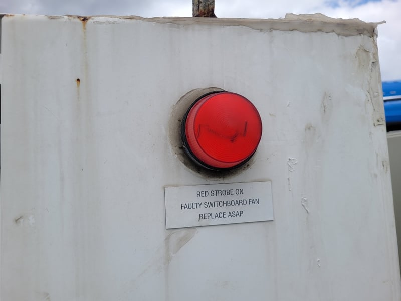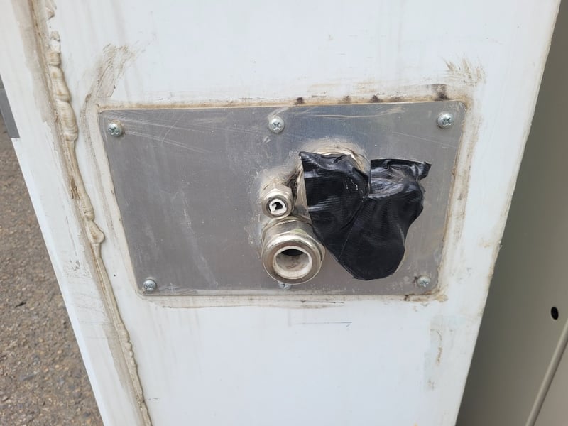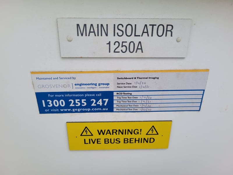 breaker panels with multiple breakers, three-phase bus bars with protective colour-coded insulators (red, white, blue), and comprehensive safety labelling including "LIVE BUS BEHIND" warning. Equipped with cable glands, ventilation louvres, and inspection ports. External cable entry points visible. Unit shows evidence of previous operational use with minor corrosion and weathering. Manufactured date 26/10/2012. Ideal for industrial, construction, or temporary power distribution applications.