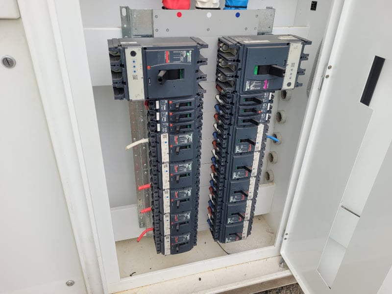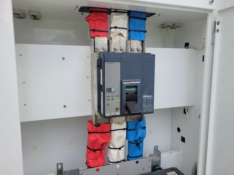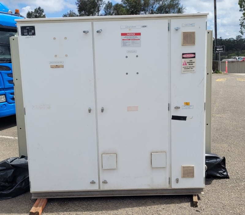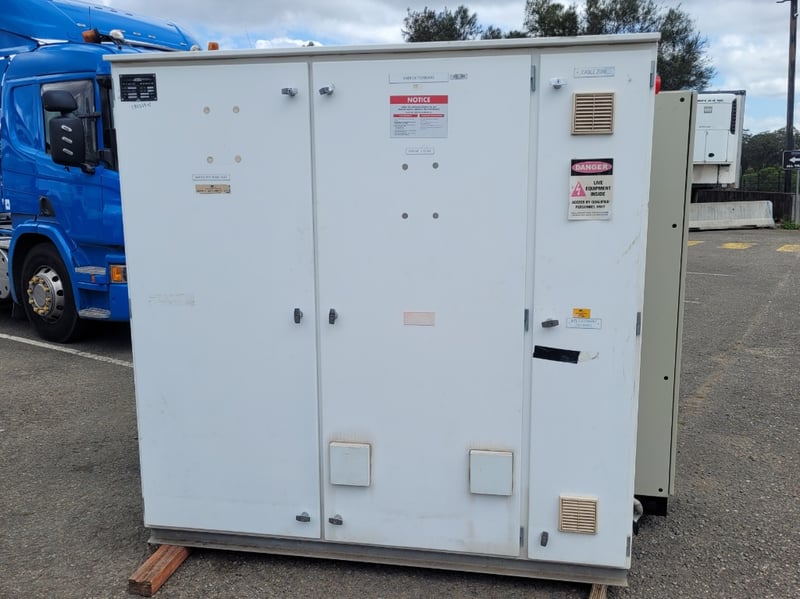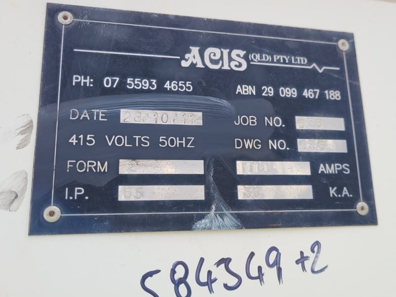 Portable three-phase electrical switchboard enclosure manufactured by ACIS (QLD) PTY LTD, rated 415 volts, 50Hz. Unit features dual-door configuration with white powder-coated steel construction. Interior contains main isolator switch (1250A capacity), dual Schneider circuit