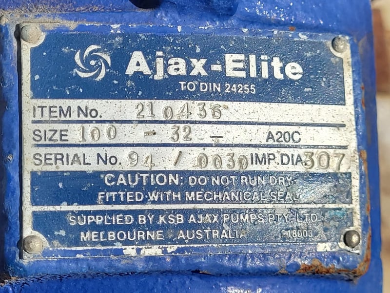 Description: Used, Ajax-Elite, unknown working condition, saerial number 94/0030, size 100-32, item no. 210436, IMP.DIA 307, note rust evident, inspection recommended.