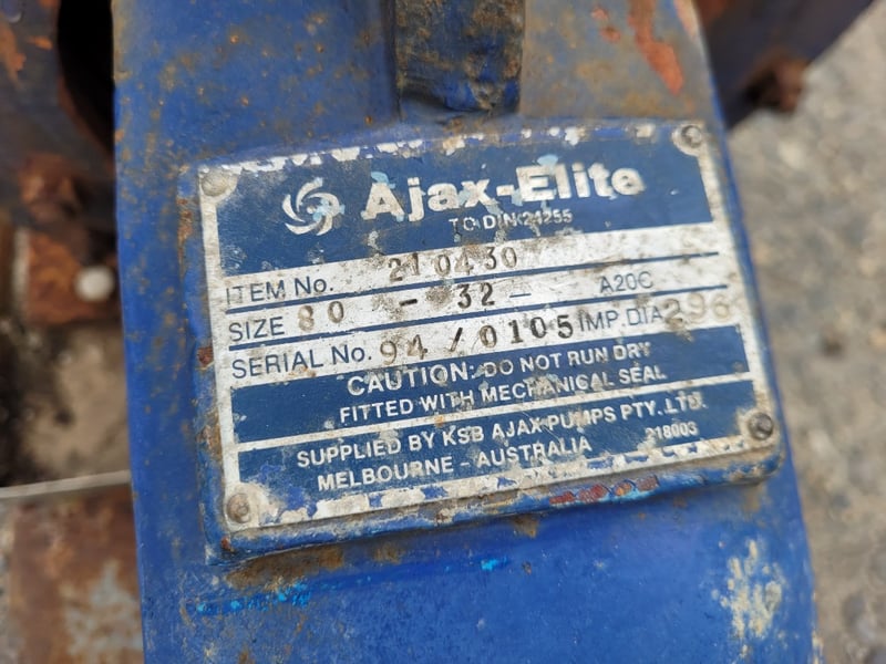 Horizontal Pump And Motor Description: Ajax-Elite Pump, Serial Number 94/0105, size 80-32, IMP, DIA 269, note used, rust evident, marks dents and scratches. Location: Acacia Ridge