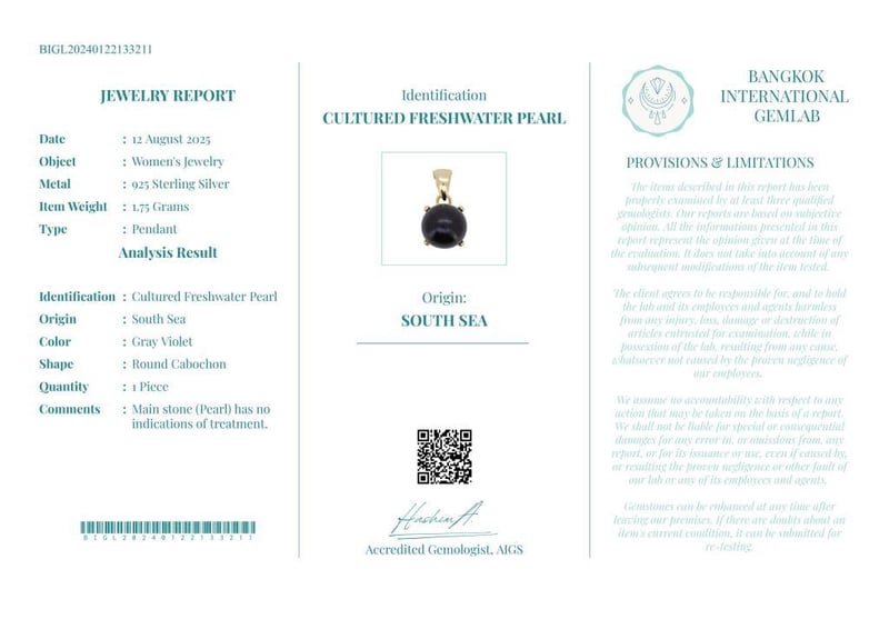 CULTURED FRESHWATER PEARL PENDANT ON 925 SILVER - WITH CERTIFICATE Gemstone : Cultured Freshwater PearlCertificate Number : Bigl20240122133211Item Total Weight : 1.75 GramsMain Stone Color : Gray VioletSize : Comments : Main Stone (Pearl) Has No Indications Of Treatment. ✻ Verify Report Online At Www.Bangkokinternationalgemlab.Co 0+49