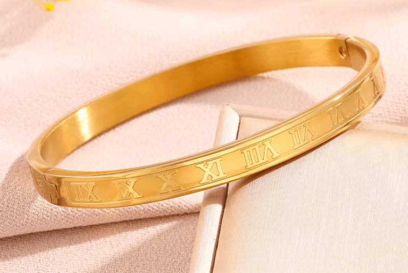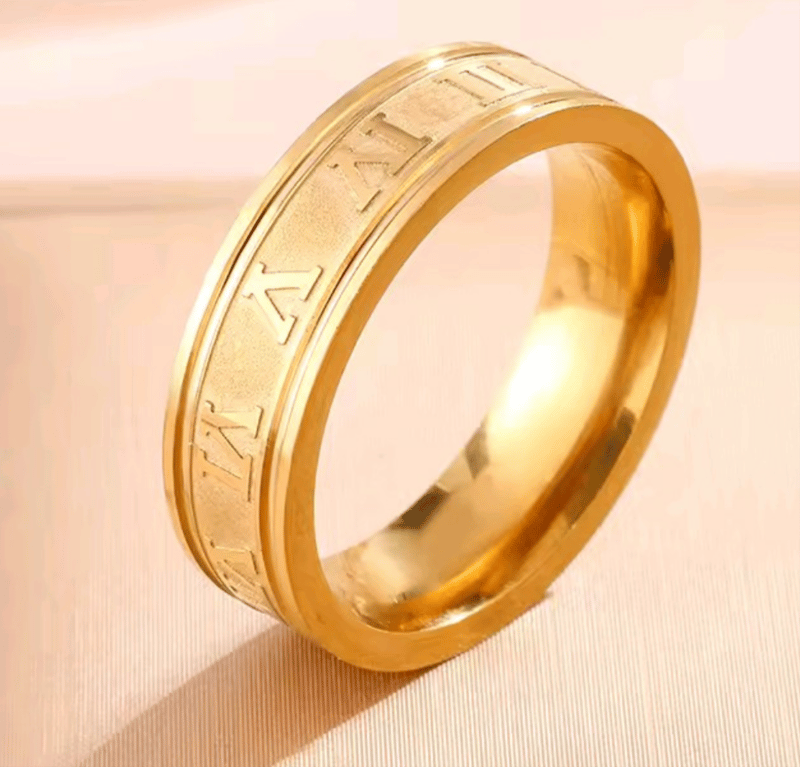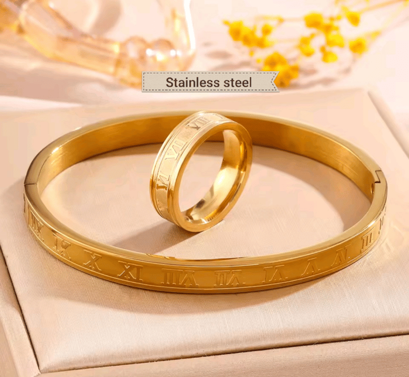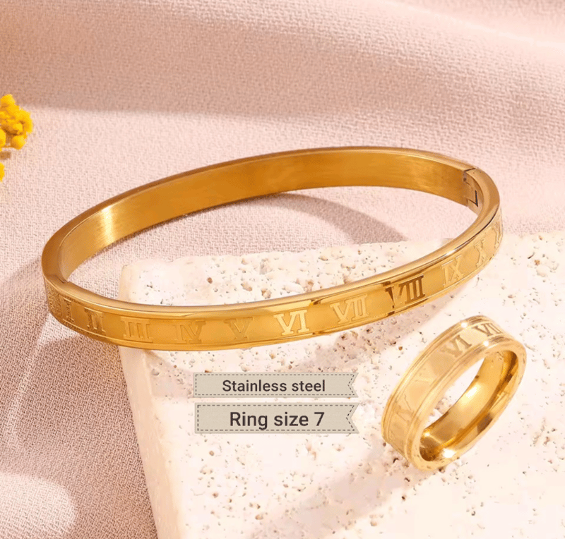 GOLD STAINLESS STEEL ROMAN NUMERAL BANGLE AND RING SIZE 7