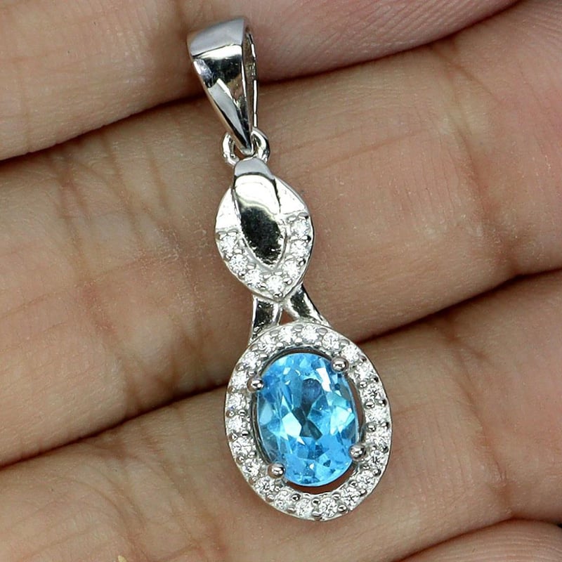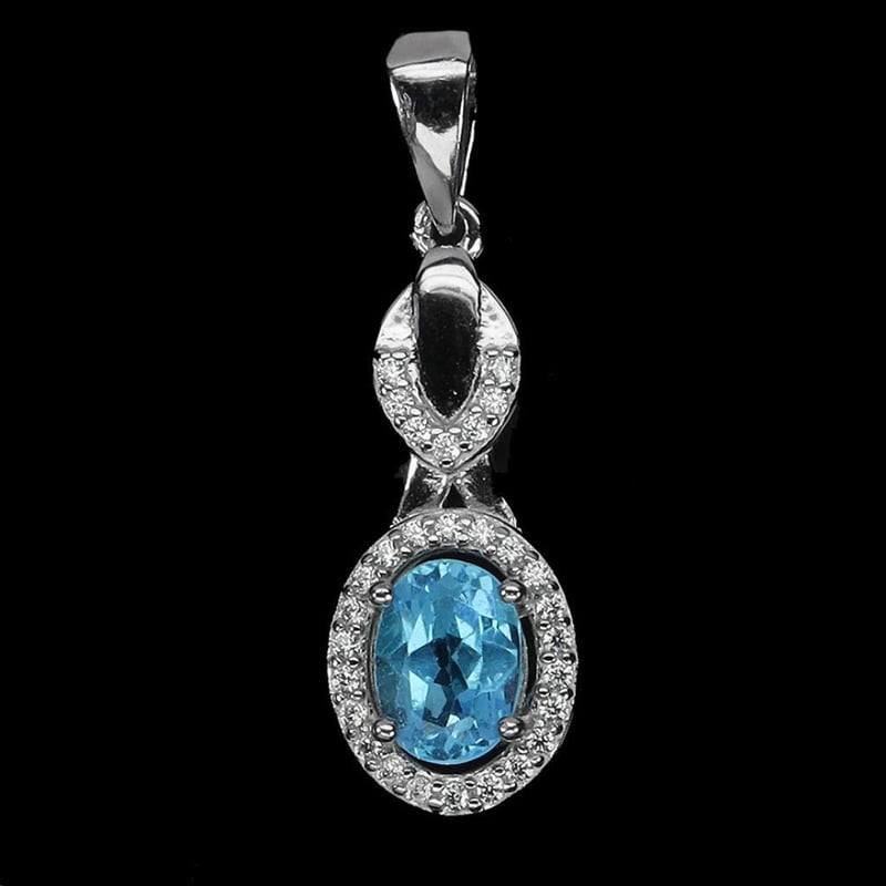 NATURAL SWISS BLUE TOPAZ PENDANT. Natural Swiss Blue Topaz Pendant. Made In Solid Sterling Silver And Plated In14K White Gold. Features Natural Swiss Blue Topaz And Sparkling Czs. Pendant Measures 27.0 X 9.0 Mm. Condition: Good - Refer Images 0488375+2