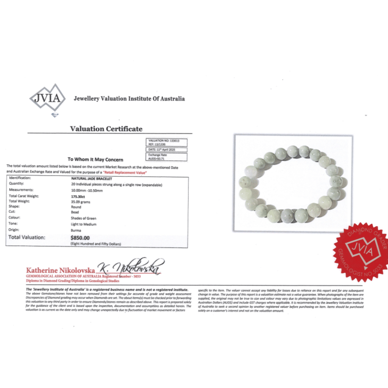 BURMESE JADE BEAD BRACELET. 20 Round, Light To Medium Shades Of Green, (175.30Ct Tsw, 10.00Mm-10.50Mm Beads), Burmese Origin, Individually Strung, Expandable. Valuations Provided by an Independent Third-Party Professional Not Directly Associated With Lloyds Auctions at AUD $$850.00This valuation has been conducted by an independent third-party professional. The valuation amount is an assessment by the issuing valuer and does not reflect the auction value of the item. Any inquiries regarding the valuation should be directed to the issuing valuer (refer to contact details on the certificate), as Lloyds Auctions has no affiliation or influence over the valuation, the valuer, or the stated amount. Condition: Good - Refer Images 0+1514