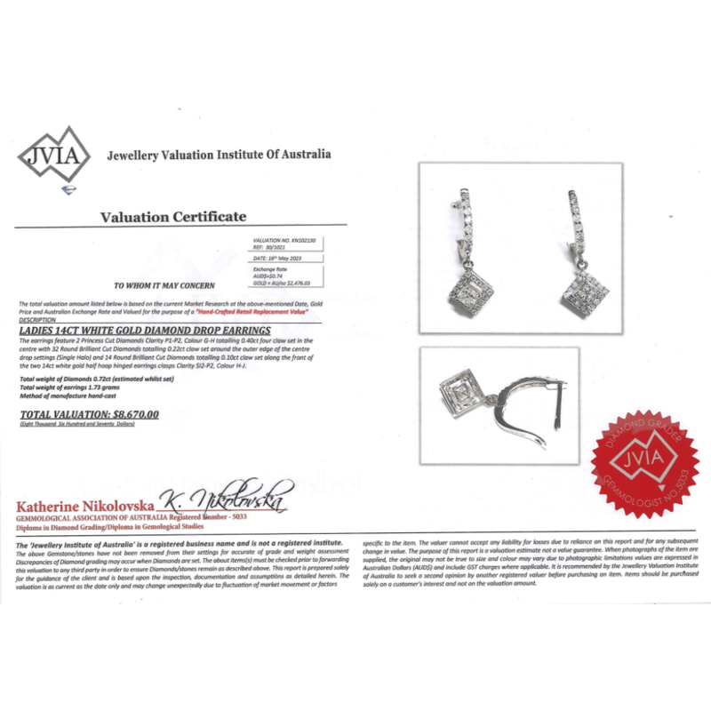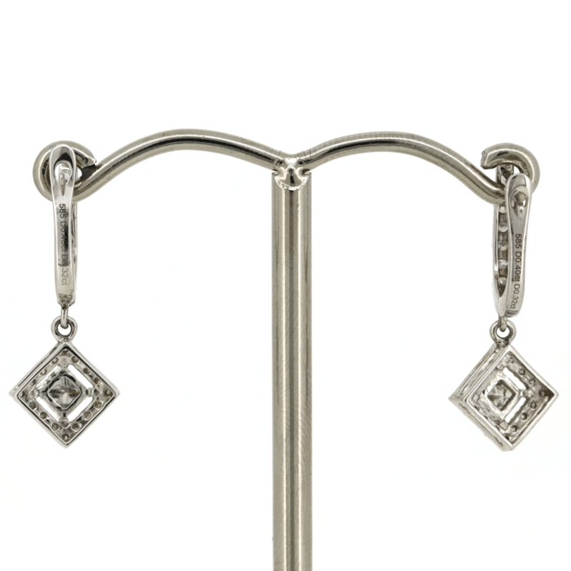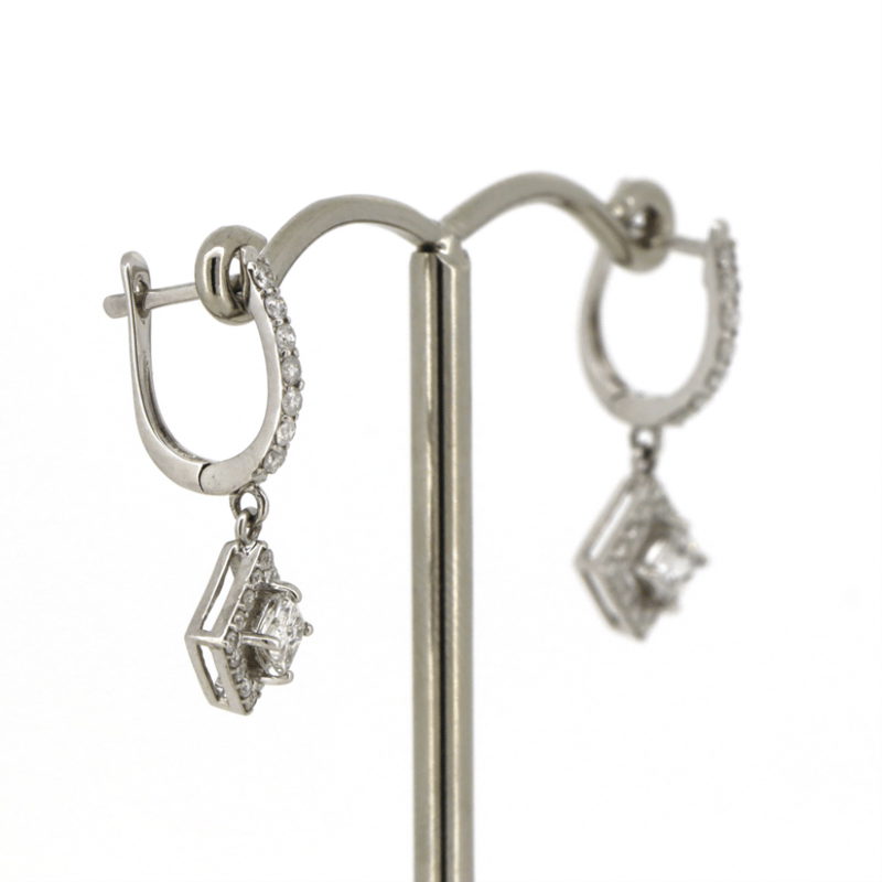 The Centres Feature, 2 Princess Cut, Diamonds (0.40Ct Tdw, G-H Colour, P1-P2 Clarity), 4 Claw Set. Surrounding The Centres In Halos And Decorating The Front Of The Hooks Are, 46 Round Brilliant Cut, Diamonds (0.32Ct Tdw, H-J Colour, Si2-P2 Clarity), Claw Set. The Earrings Have Latch Back Closures.