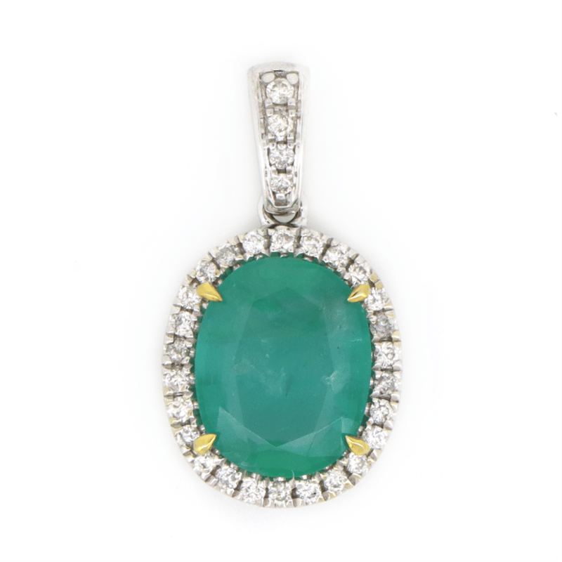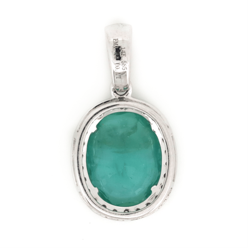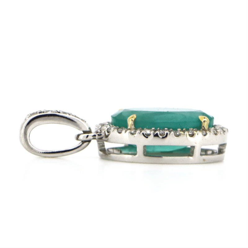 14K WHITE GOLD, EMERALD AND DIAMOND, HALO PENDANT.