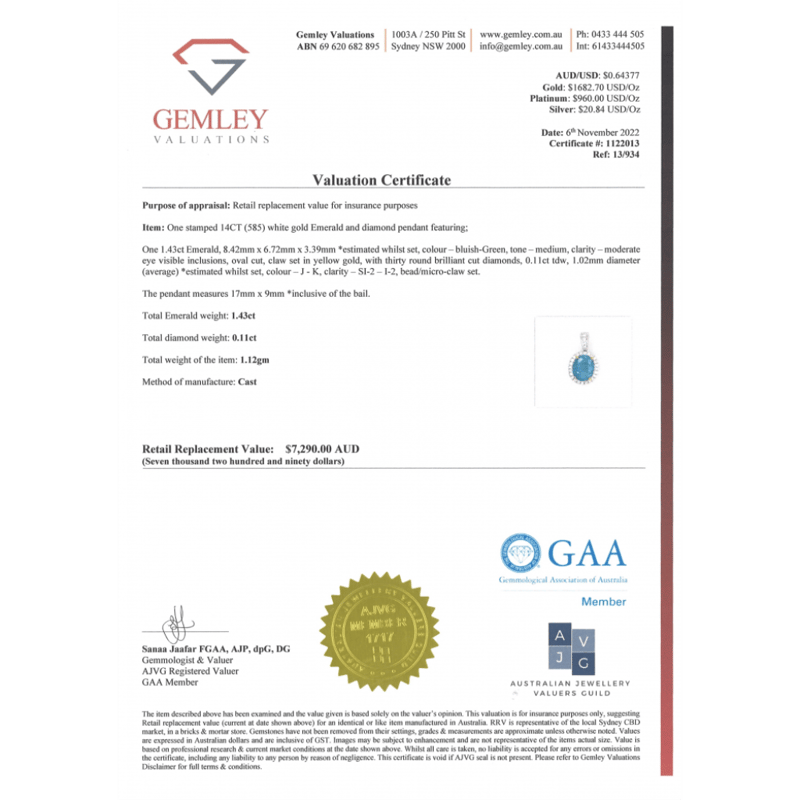 The Centre Features, One Oval Cut, Bluish-Green, Emerald (1.43Ct, Moderate Eye Visible Inclusions), Claw Set In Yellow Gold. Surrounding The Centre In A Halo And Decorating The Bail Are, 30 Round Brilliant Cut, Diamonds (0.11Ct Tdw, J-K Colour, Si2-I2 Clarity), Bead/Micro-Claw Set.