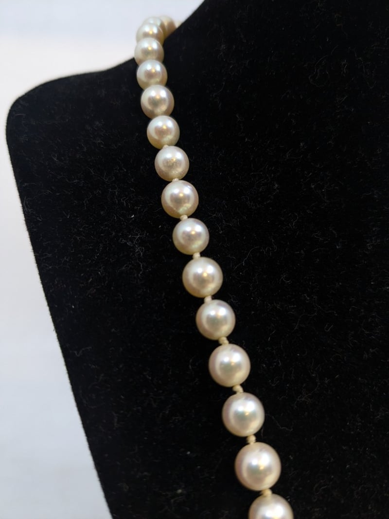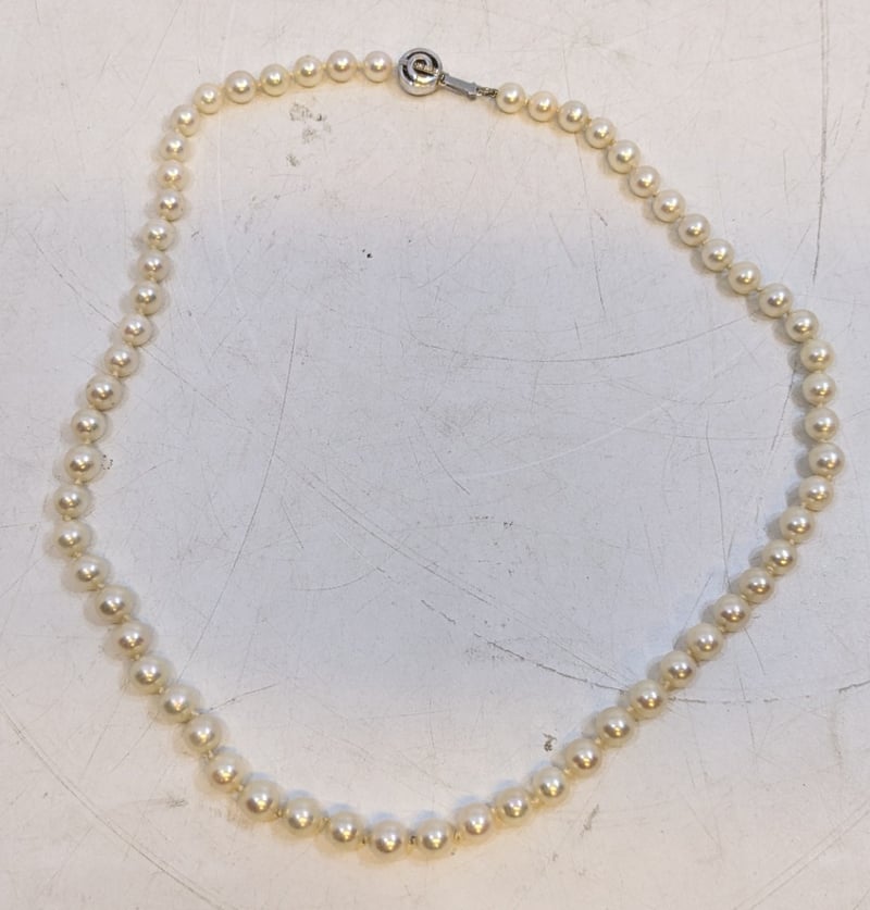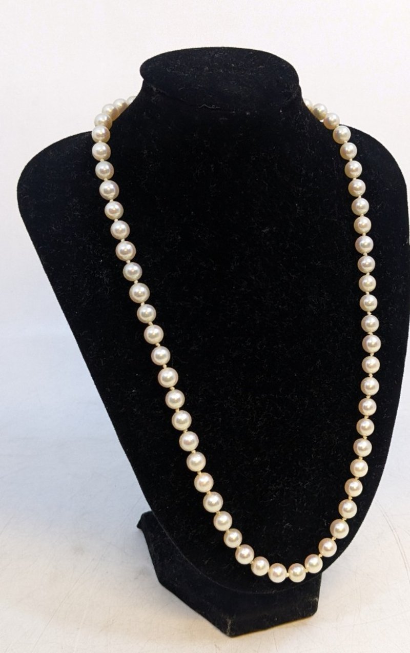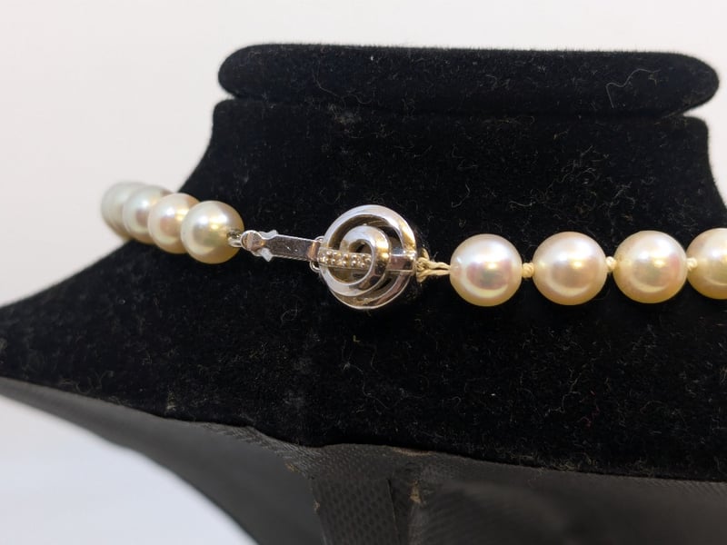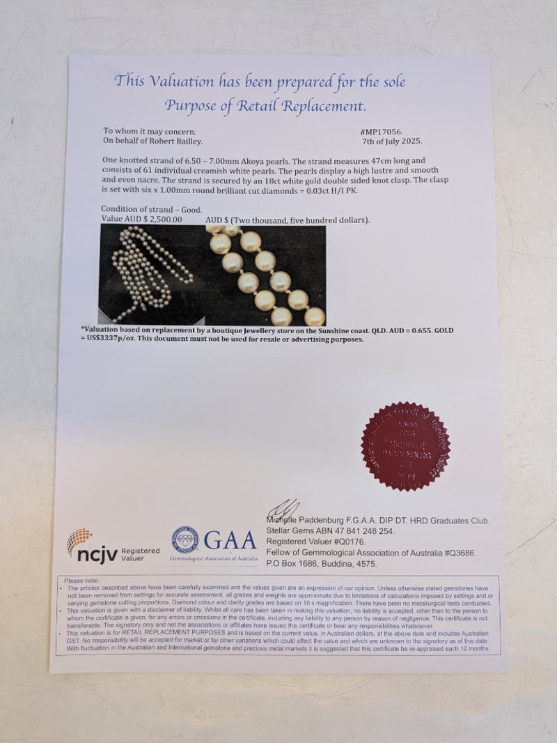 47CM STRAND AKOYA PEARLS NECKLACEContains 61 Individual Cream White PearlsSecured By An 18Ct White Gold Double Sided Knot ClaspClasp: 6 X 1.00Mm Round Brilliant Cut Diamonds = 0.3Ct H/I PkTotal Item Weight: 29.00gLength: 47.00cmCondition: Good - Refer To ImagesThis valuation has been conducted by an independent third-party professional. The valuation amount is an assessment by the issuing valuer and does not reflect the auction value of the item.Any inquiries regarding the valuation should be directed to the issuing valuer (refer to contact details on the certificate), as Lloyds Auctions has no affiliation or influence over the valuation, the valuer, or the stated amount.Insurance Replacement Valuation Amount: $2,500.00585025+9