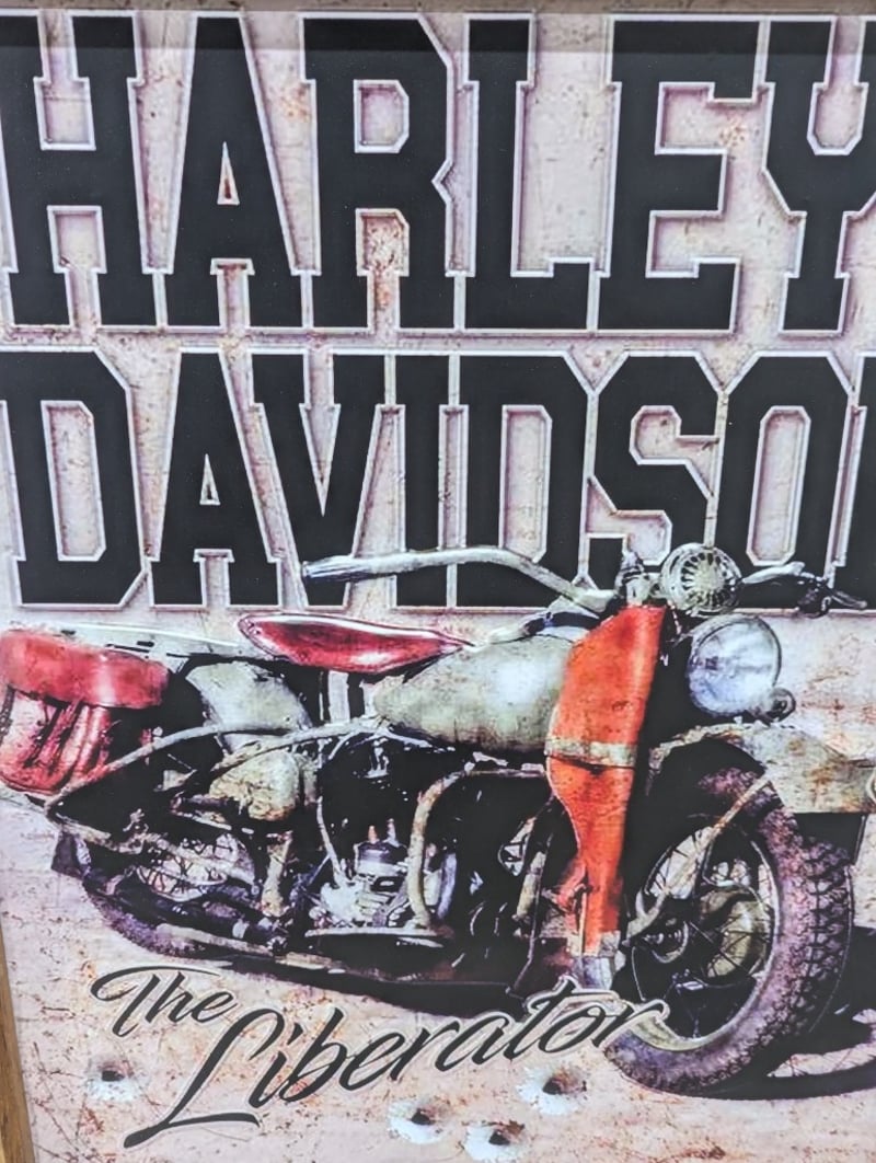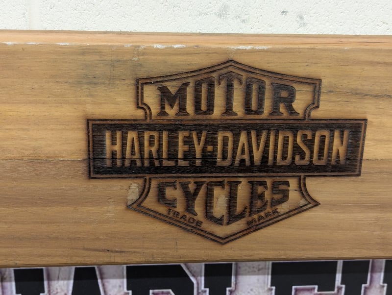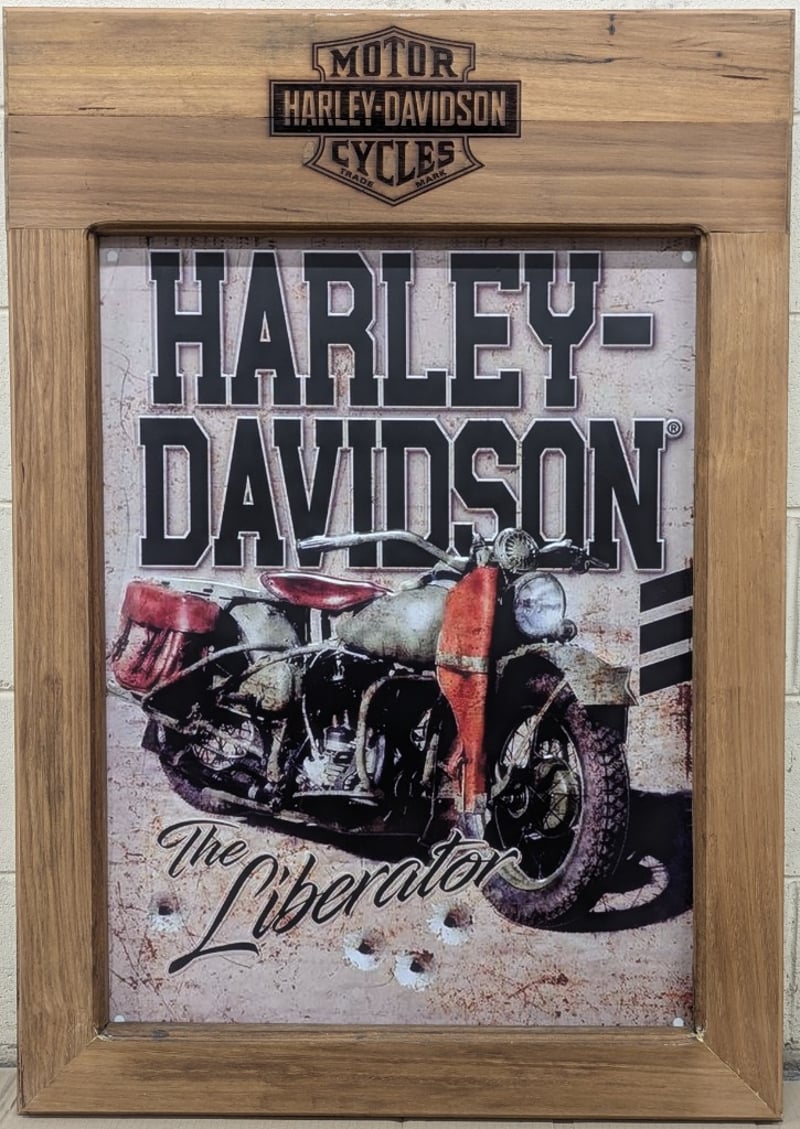 HARLEY DAVIDSON MOTORCYCLE DECORATIVE TIMBER SIGN Item Size: Height: 111cm, Width: 78cm, Depth: 4cm, Weight: 15.8Kg Timber Board With Engraved Harley Davidson Logo, Harley Davidson 'The Liberator' Picture On Centre Board 586274+2