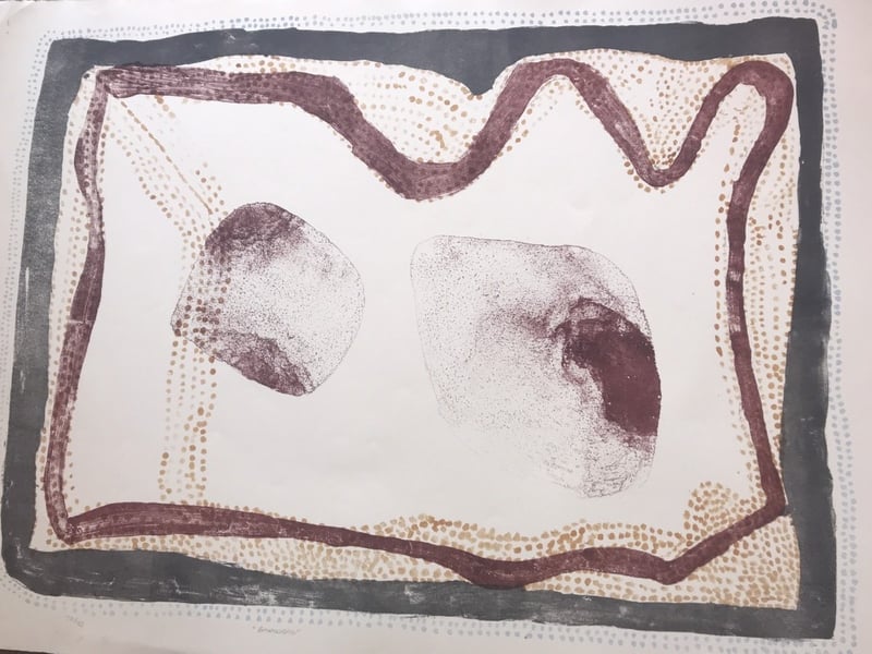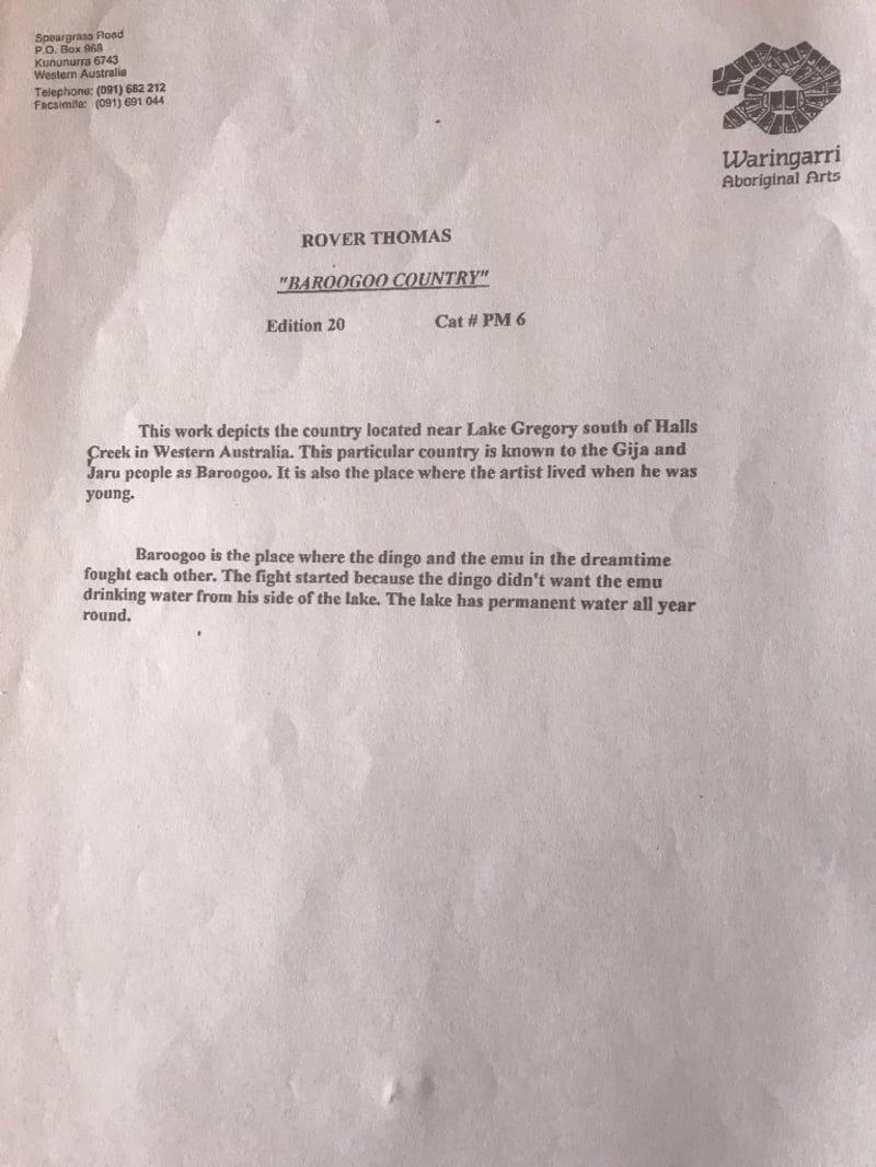 ROVER THOMAS (JULUMA) (1926 - 1998) Original Lithograph On Canvas Title: Baroogoo, 1996 Image Size: 76cm x 112.5cm Signature Details: Signed Lower Right Condition: Good - Refer To Images Provenance: Purchased It In 1996 In Warman Community (Turkey Creek)From The Community Gallery Waringarri Aboriginal Arts. Artwork Is Unframed. Accompanied By Certificate Of Authenticity. Crossdock 163000+13