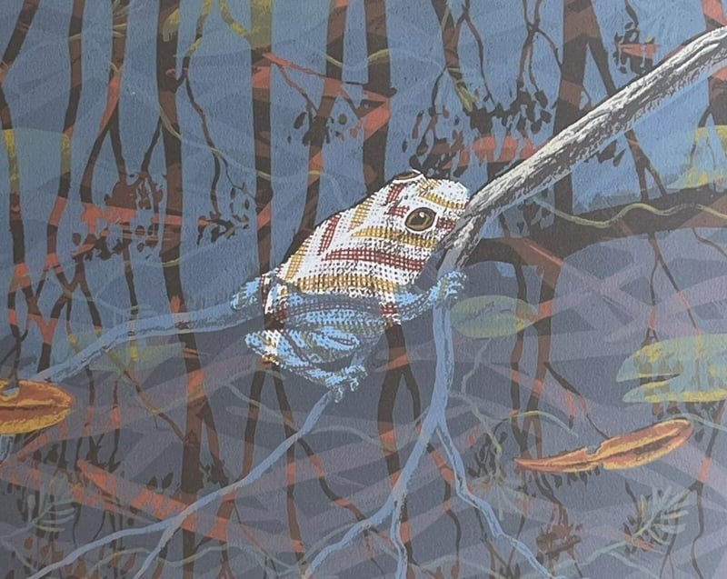 It Is This Lonely Frog On A The Bed Of Colorful Leaves With Onus Famous Reflection.