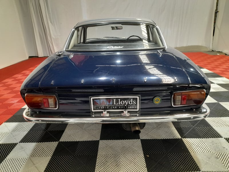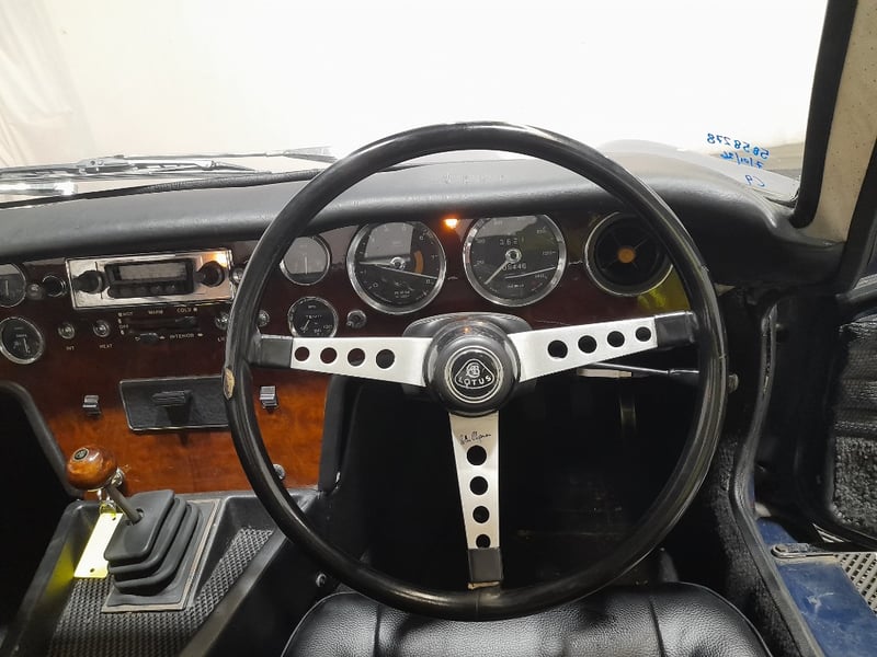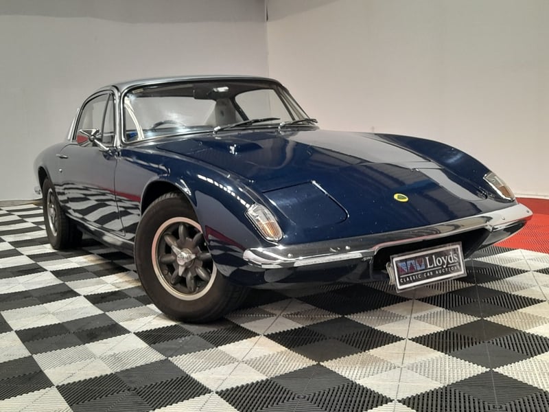 1968 Lotus Elan +2 two-door coupe finished in blue, featuring a lightweight rear-wheel-drive configuration. Powered by a 1.6-litre inline four-cylinder petrol engine paired with a four-speed manual transmission. Odometer indicating 5,446 miles.