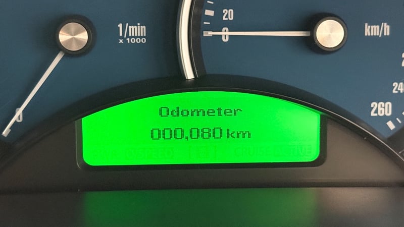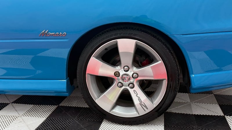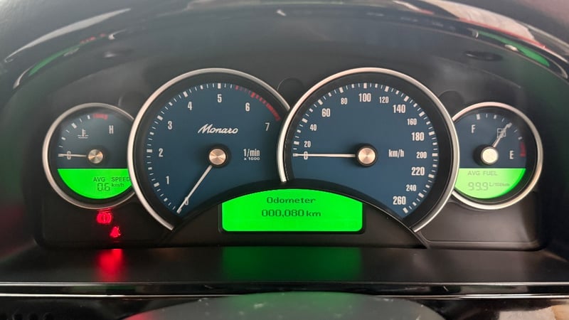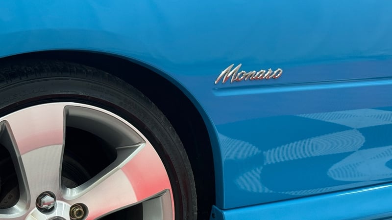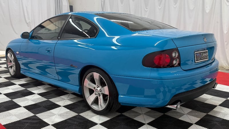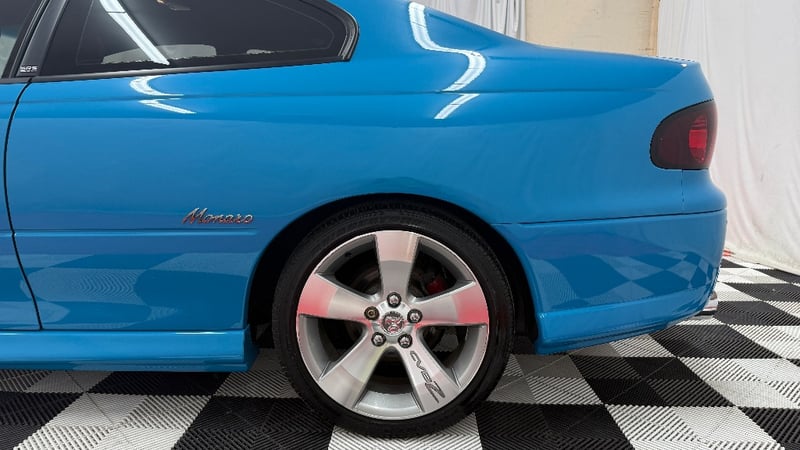 2005 Holden Monaro CV8‑Z two‑door coupe finished in Turismo Blue. Rear‑wheel drive configuration powered by a 5.7‑litre V8 petrol engine paired with a four‑speed manual transmission. Odometer indicating just 80 kilometres from new.
