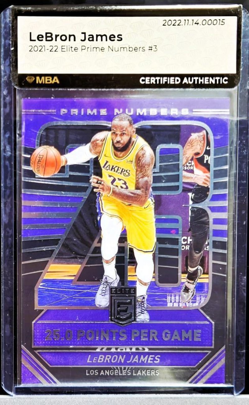 - 2021 Donruss Elite Prime Numbers Lebron James: The Second Card Is The 2021 Donruss Elite Prime Numbers Lebron James #3, Depicting Lebron James From A Modern Premium Insert Series. The Prime Numbers Subset Is Noted For Its Thematic Design And Contemporary Appeal, With Mba Authentication Providing Assurance Of Legitimacy.