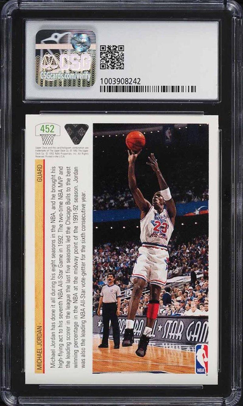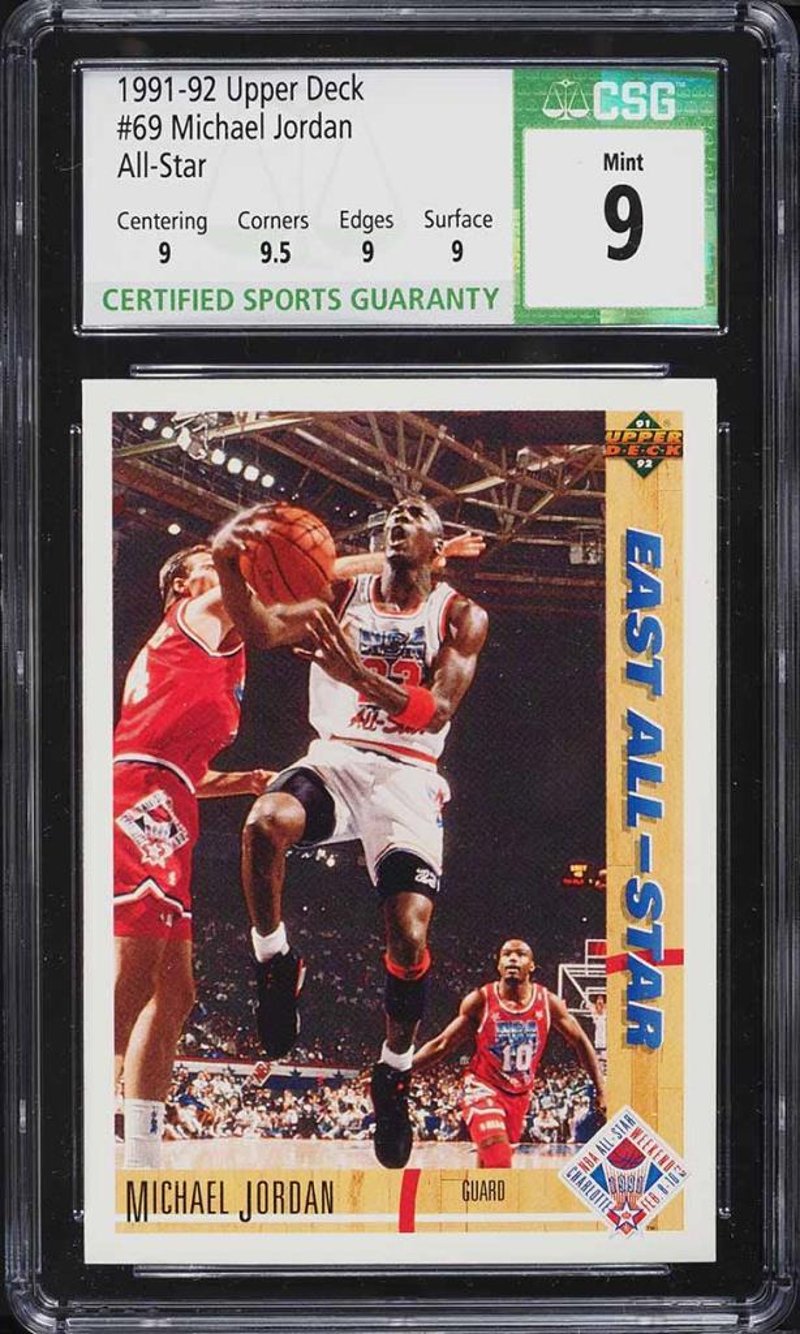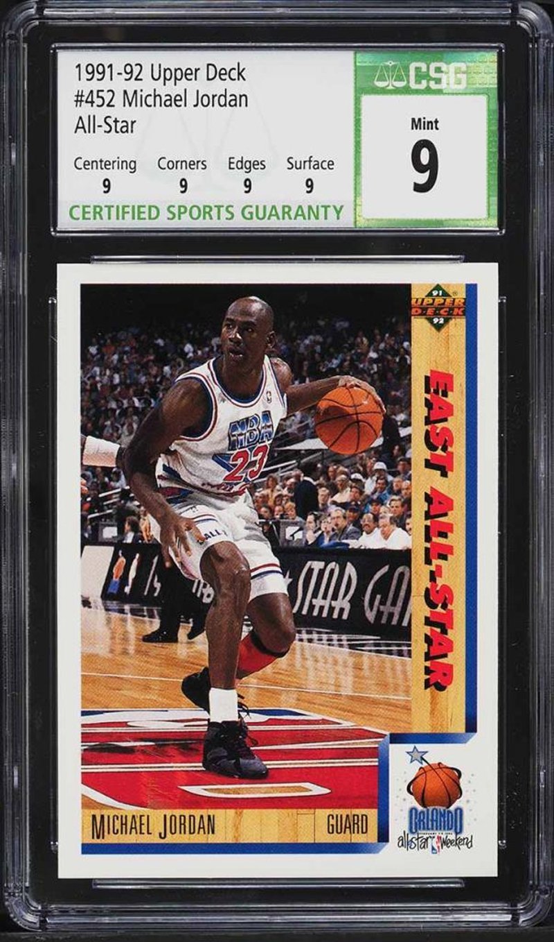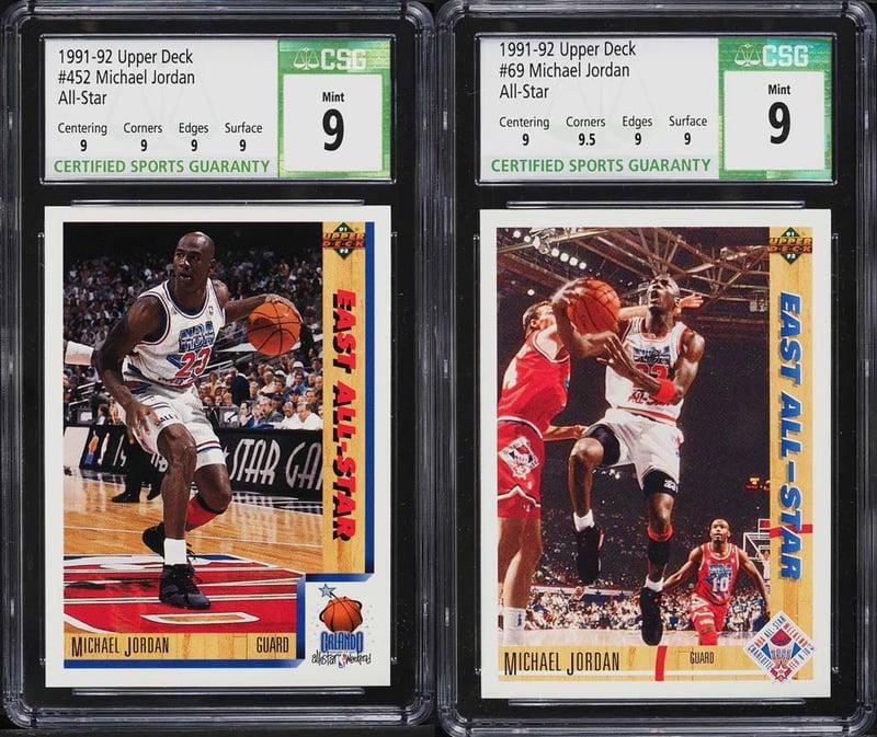 1991 UPPER DECK MICHAEL JORDAN MINT GRADE DUO – CSG 9 NBA BASKETBALL - CHICAGO BULLS GOAT #23 This Auction Lot Comprises Two Professionally Graded 1991 Upper Deck Basketball Michael Jordan Cards, Each Assessed Csg 9 Mint And Originating From One Of The Most Widely Collected Early 1990S Basketball Releases.- 1991 Upper Deck Basketball Michael Jordan #69: The First Card Is The 1991 Upper Deck Basketball Michael Jordan #69, Graded Csg 9 Mint, Featuring Michael Jordan During The 1990–91 Nba Season. This Base Issue Card Is Recognised For Its Clean Design And Remains A Staple Within Jordan Focused Collections.- 1991 Upper Deck Basketball Michael Jordan #452: The Second Card Is The 1991 Upper Deck Basketball Michael Jordan #452, Also Graded Csg 9 Mint. As A Later Series Card Within The Same Release, It Provides Complementary Representation From The Set While Maintaining Consistent Grading And Overall Presentation.Together, These Two Cards Form A Well Matched And Visually Cohesive Pair, Unified By Identical Grading And Set Origin. The Lot Is Suitable For Collectors Seeking Mint Condition Jordan Cards From The 1991 Upper Deck Series, Or A Concise Dual Card Offering Suitable For Display Or Long Term Collection.Condition: Good - Refer To Images