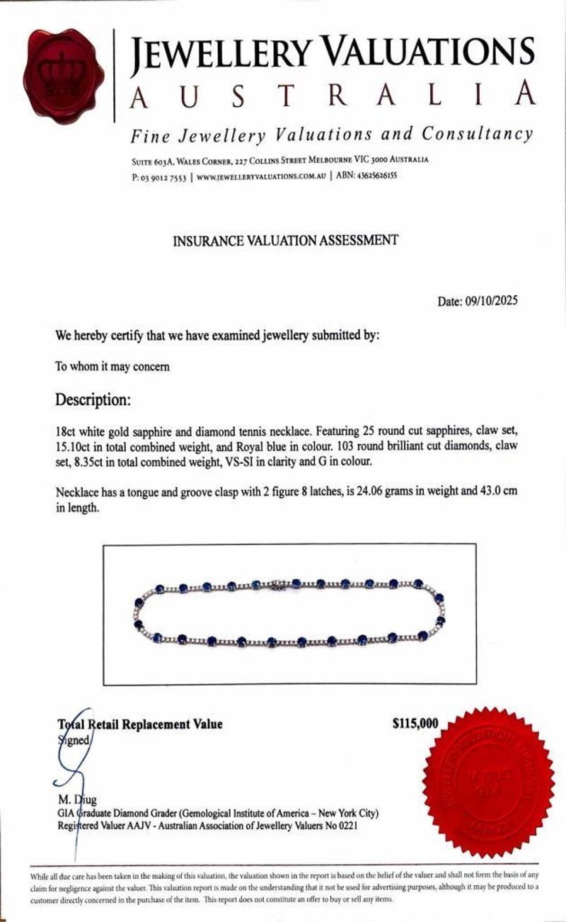 Featuring 25 Round Cut Sapphires, Claw Set, 15.10Ct In Total Combined Weight, And Royal Blue In Colour. 103 Round Brilliant Cut Diamonds, Claw Set, 8.35Ct In Total Combined Weight, Vs-Si In Clarity And G In Colour.