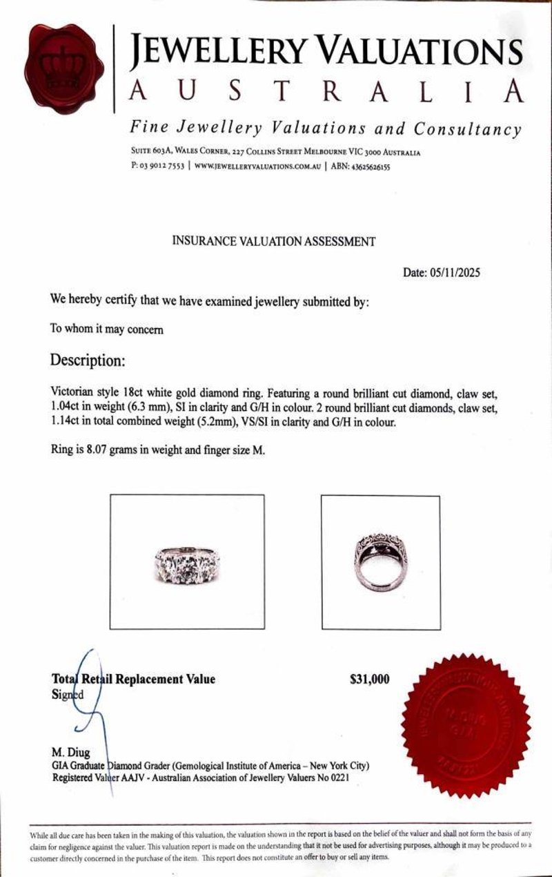 Featuring A Round Brilliant Cut Diamond, Claw Set, 1.04Ct In Weight (6.3 Mm), Si In Clarity And G/H In Colour. 2 Round Brilliant Cut Diamonds, Claw Set, 1.14Ct In Total Combined Weight (5.2Mm), Vs/Si In Clarity And G/H In Colour. Size M.