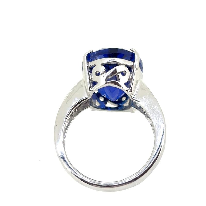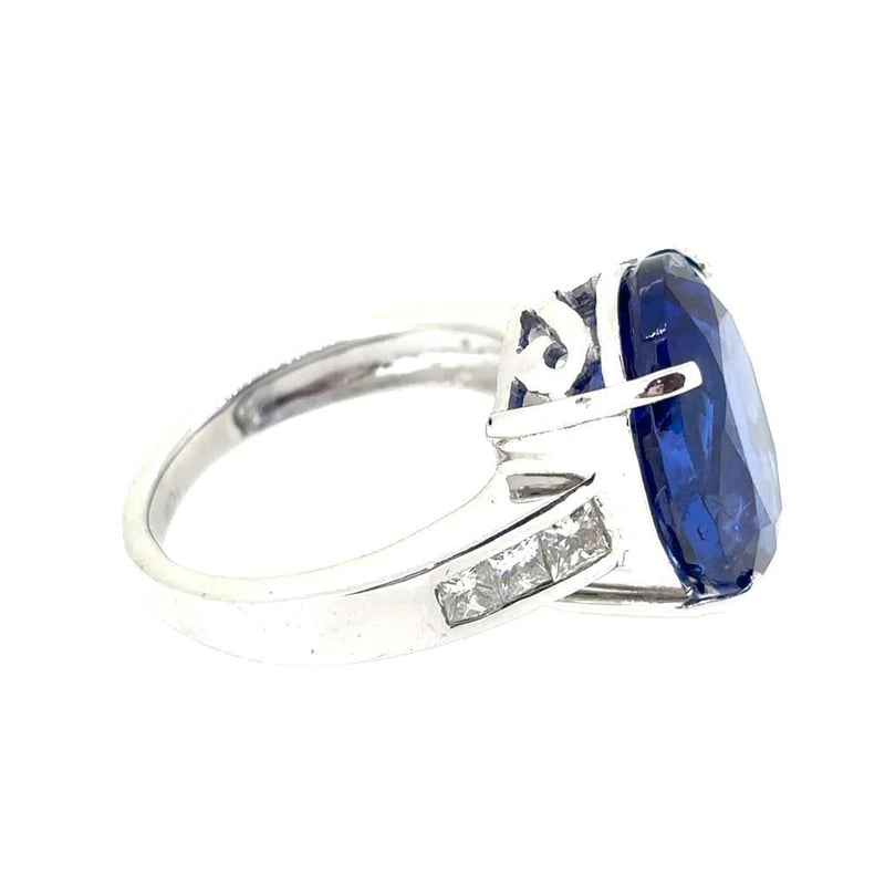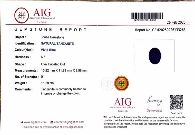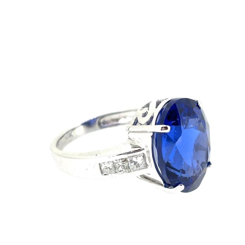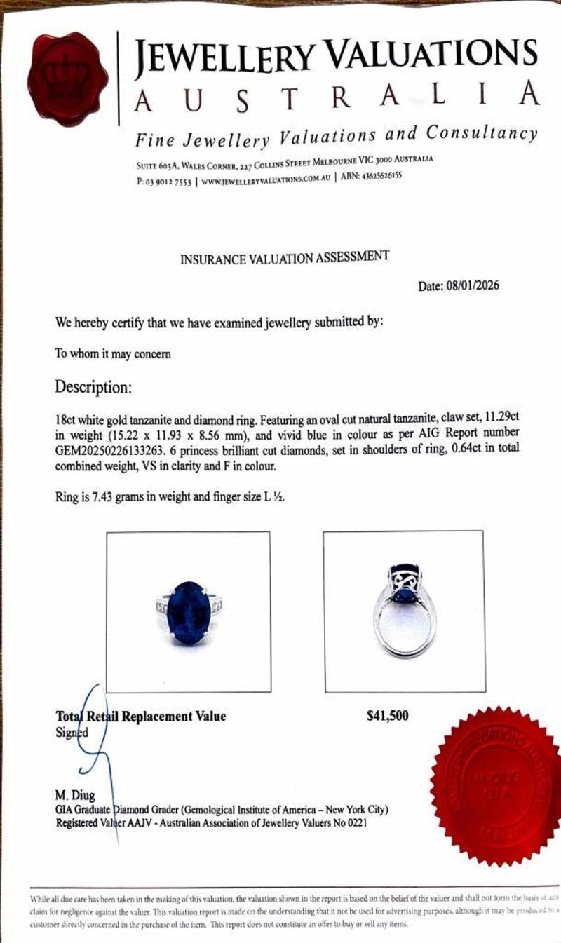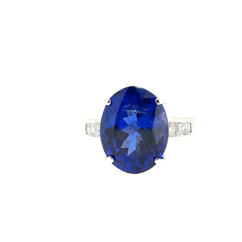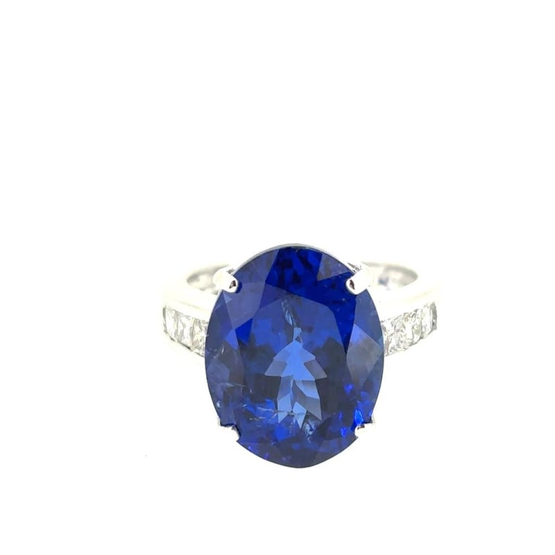 Featuring An Oval Cut Natural Tanzanite, Claw Set, 11.29Ct In Weight (15.22 X 11.93 X 8.56 Mm), And Vivid Blue In Colour As Per Aig Report Number Gem20250226133263. 6 Princess Brilliant Cut Diamonds, Set In Shoulders Of Ring, 0.64Ct In Total Combined Weight, Vs In Clarity And F In Colour. Size L½.
