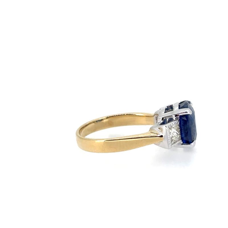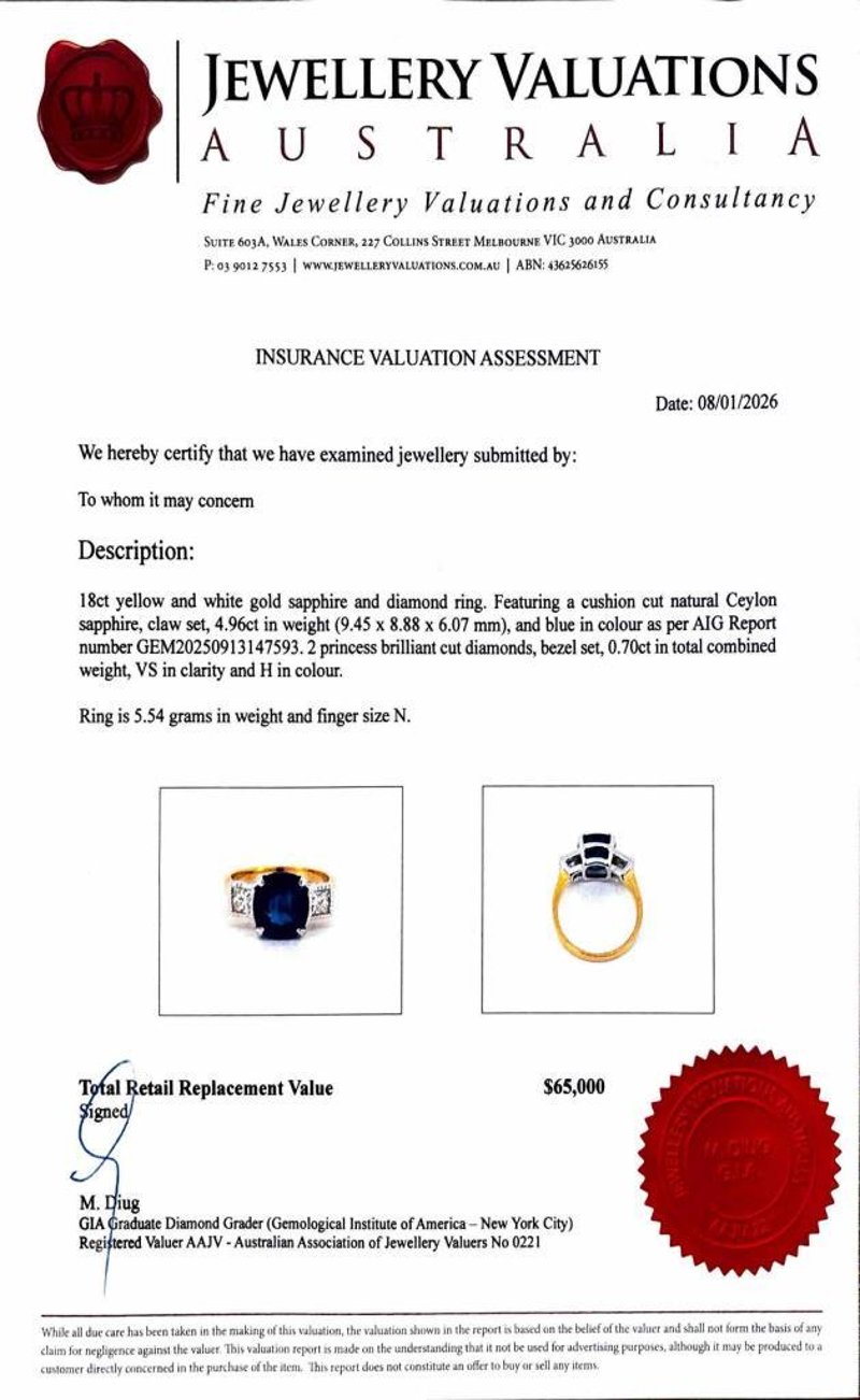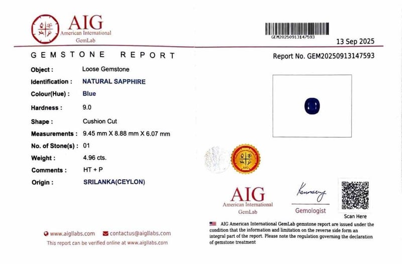 Featuring A Cushion Cut Natural Ceylon Sapphire, Claw Set, 4.96Ct In Weight (9.45 X 8.88 X 6.07 Mm), And Blue In Colour As Per Aig Report Number Gem20250913147593. 2 Princess Brilliant Cut Diamonds, Bezel Set, 0.70Ct In Total Combined Weight, Vs In Clarity And H In Colour. Size N.