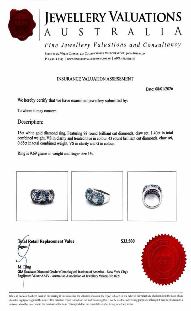 Featuring 98 Round Brilliant Cut Diamonds, Claw Set, 1.40Ct In Total Combined Weight, Vs In Clarity And Treated Blue In Colour. 43 Round Brilliant Cut Diamonds, Claw Set, 0.65Ct In Total Combined Weight, Vs In Clarity And G In Colour. Size I½