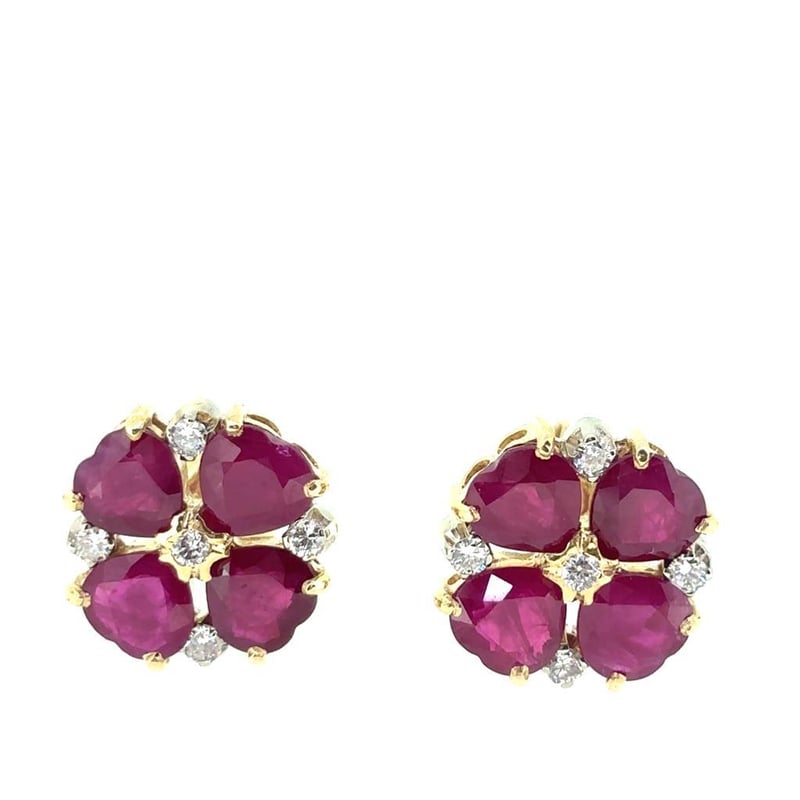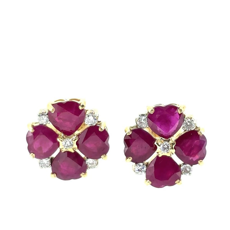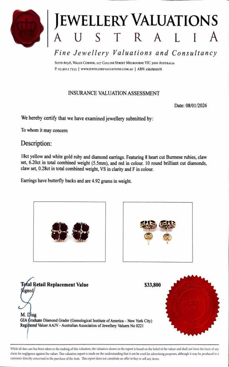 Featuring 8 Heart Cut Burmese Rubies, Claw Set, 6.20Ct In Total Combined Weight (5.5Mm), And Red In Colour. 10 Round Brilliant Cut Diamonds, Claw Set, 0.28Ct In Total Combined Weight, Vs In Clarity And F In Colour.