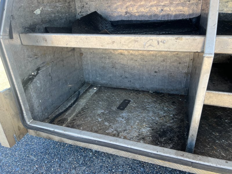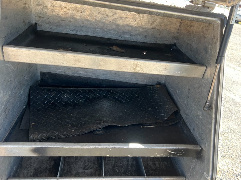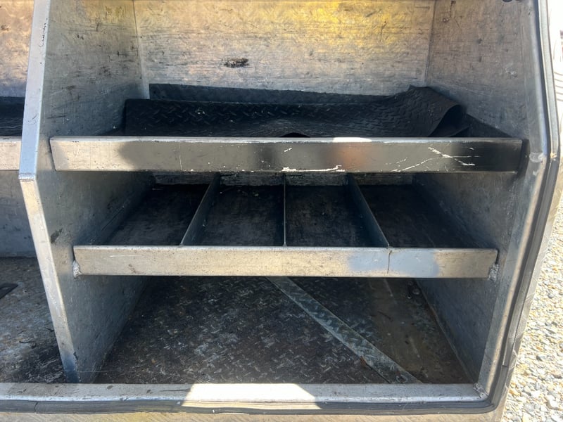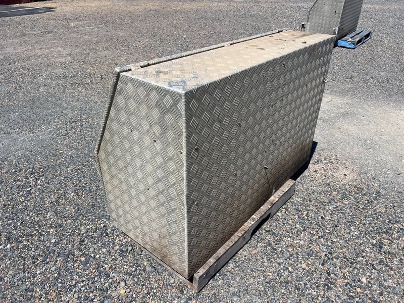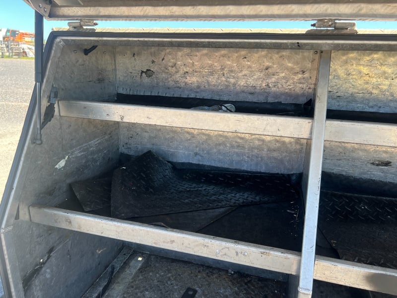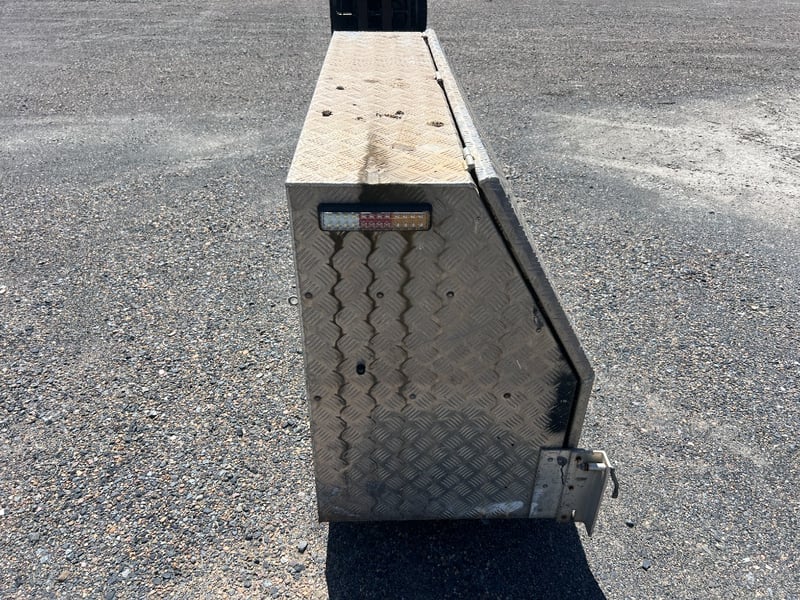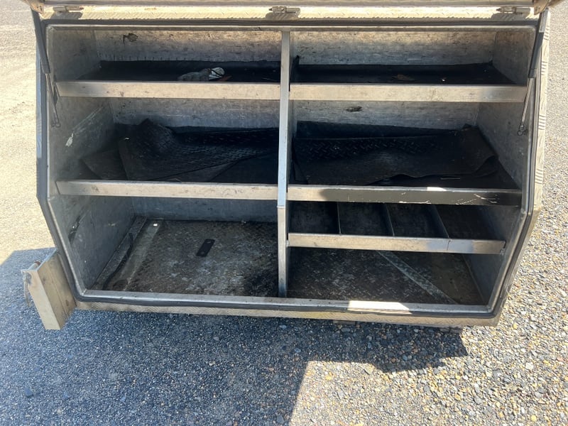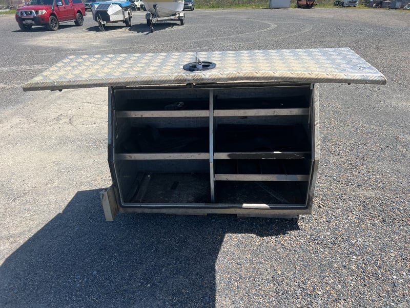 Solid aluminium checker plate toolbox, ideal for truck trays, Utes, trailers, or workshop storage. Features a full-width top-opening lid with lockable latch and gas strut support for easy access. Internally fitted with multiple fixed shelves/dividers, perfect for organising tools, parts, and equipment.