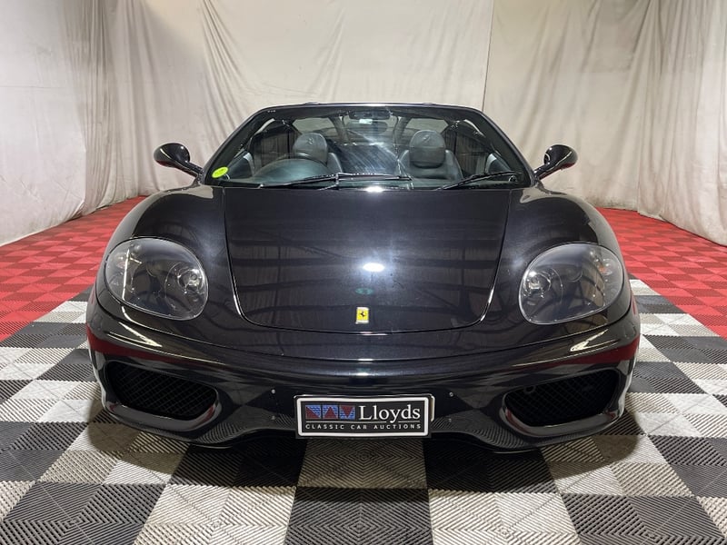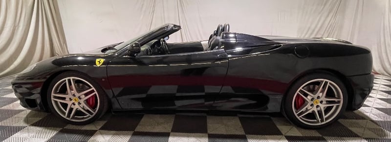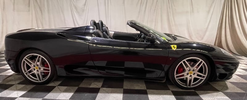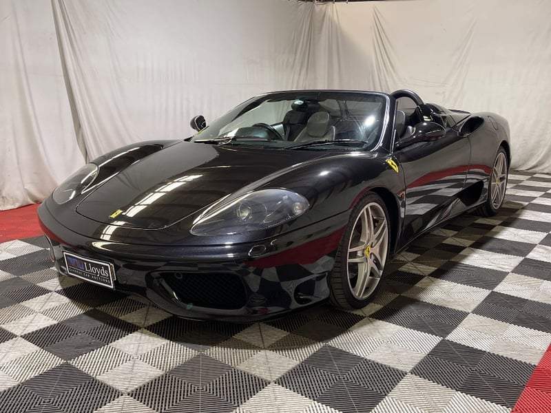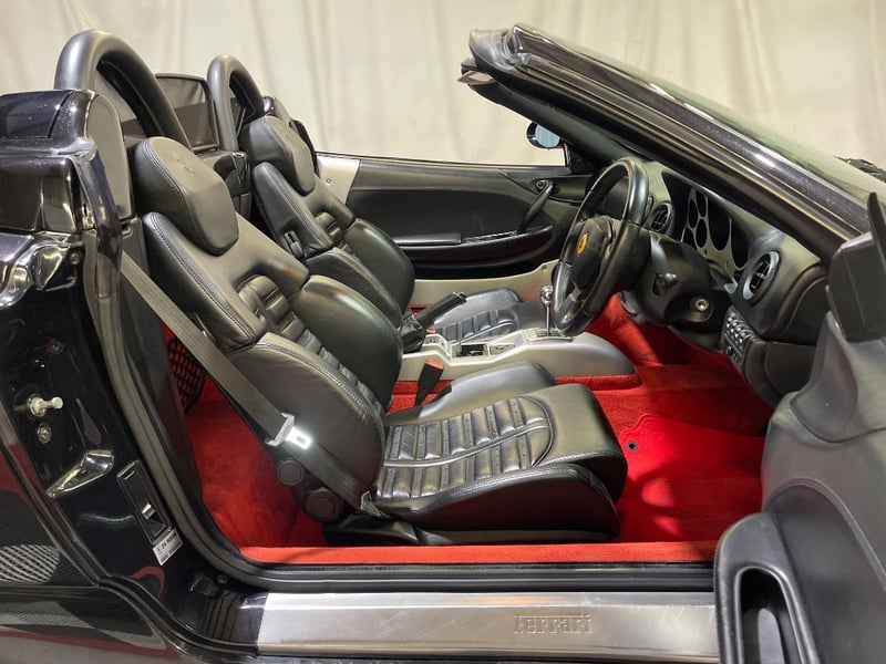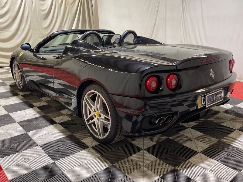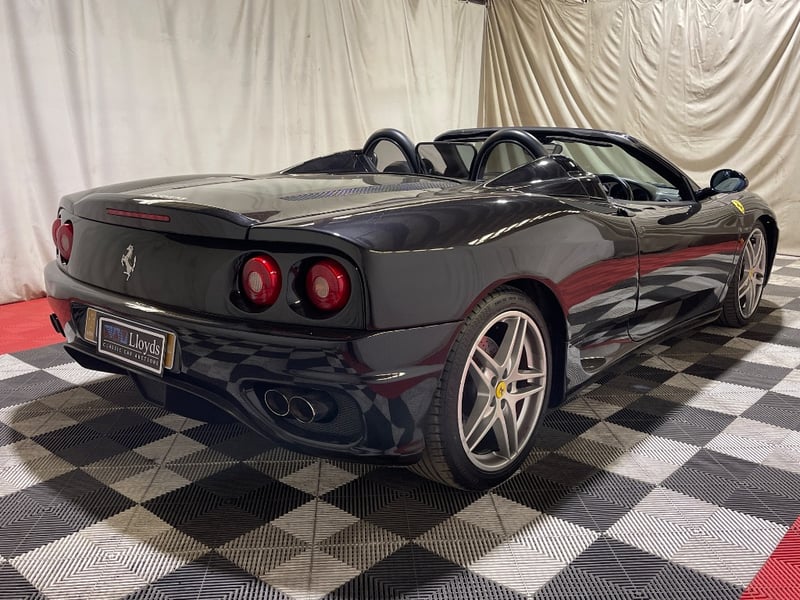 2003 Ferrari 360 Spyder two‑door convertible finished in Black. Rear‑wheel drive configuration powered by a 3.6‑litre V8 petrol engine paired with a 5‑speed manual transmission. Odometer indicating 26,237 miles. Seating for two occupants.