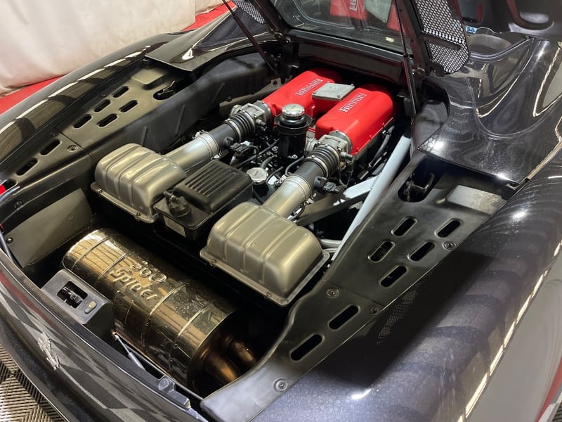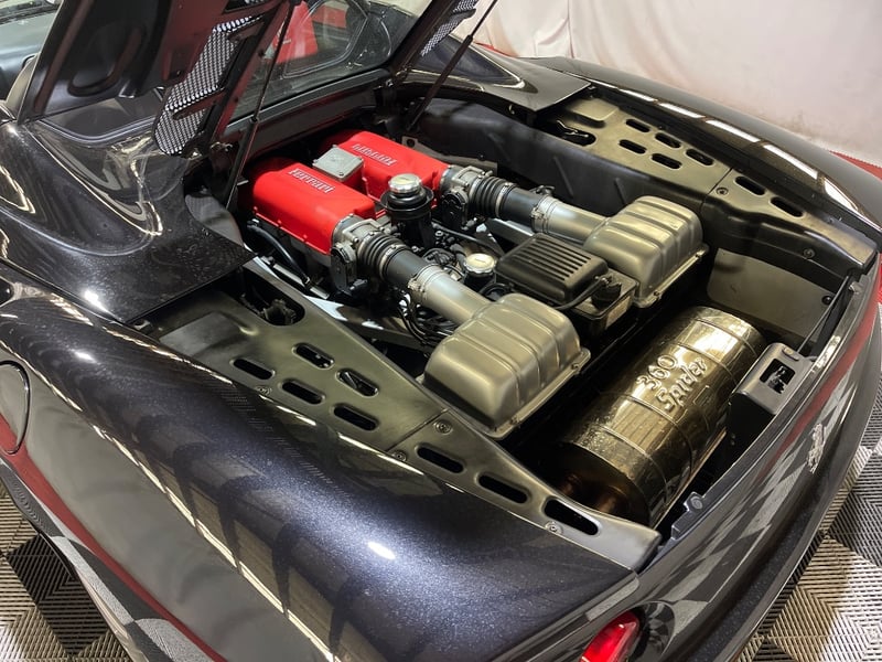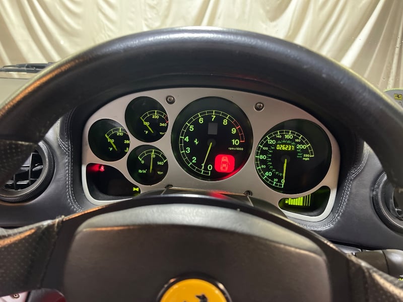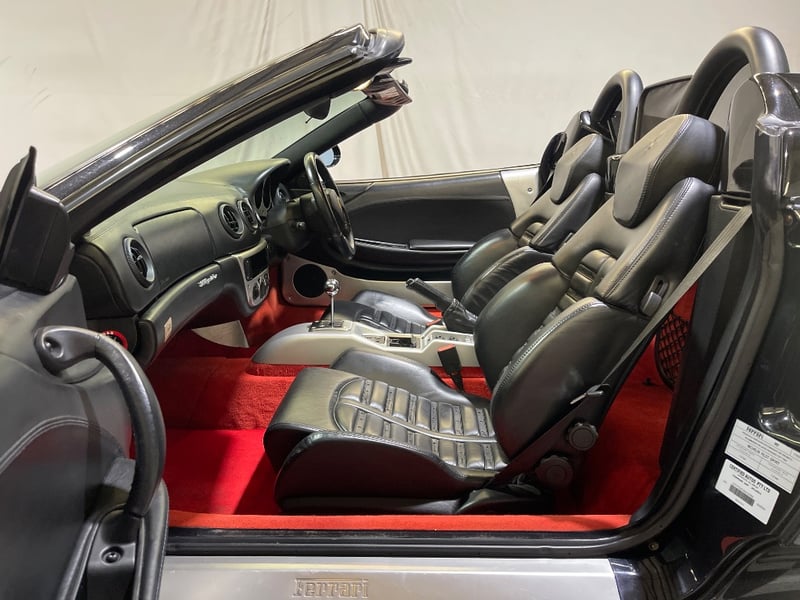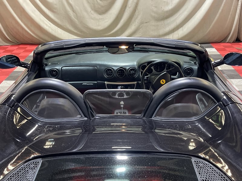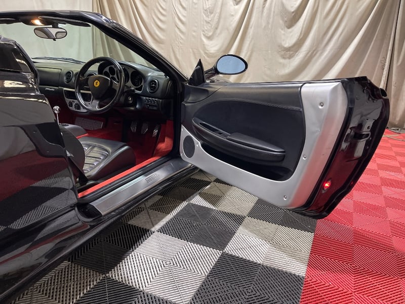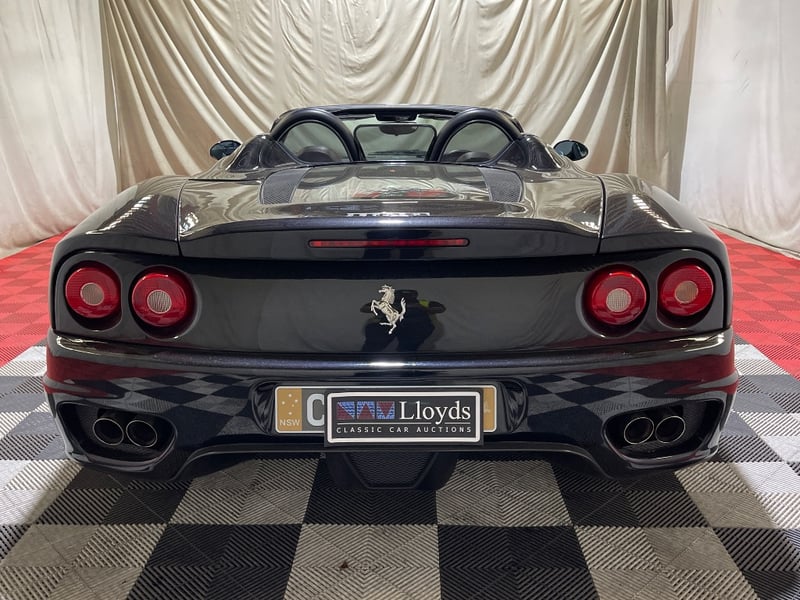 2003 Ferrari 360 Spyder two‑door convertible finished in Black. Rear‑wheel drive configuration powered by a 3.6‑litre V8 petrol engine paired with a 5‑speed manual transmission. Odometer indicating 26,237 miles. Seating for two occupants.