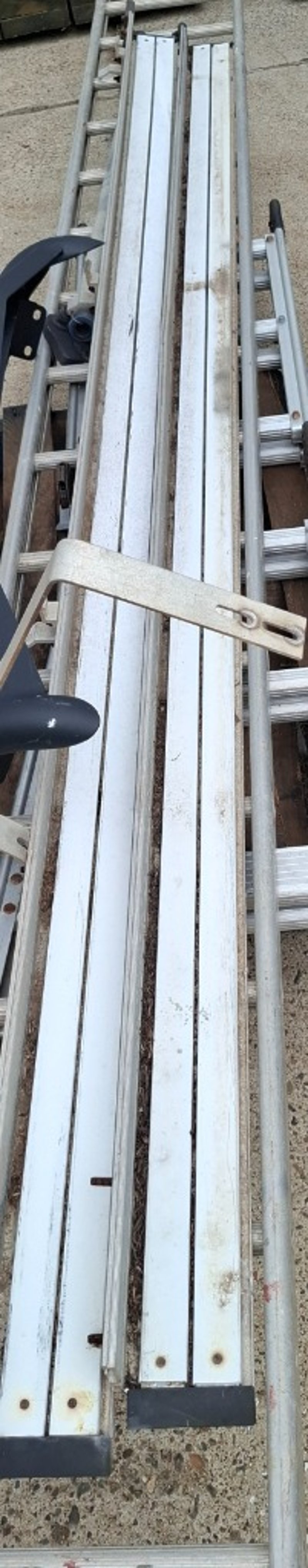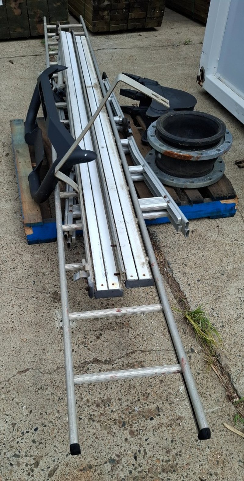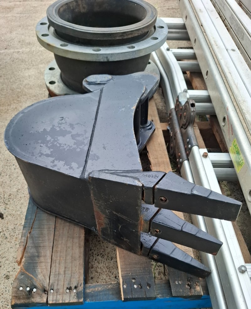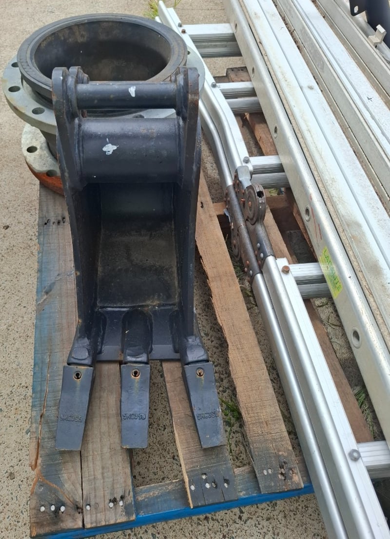 Assorted Pallet Lot Of Items Including 4 Meter Ladder, Multi Purpose Ladder, 24 Cm Excavator Bucket And More.